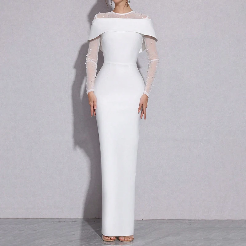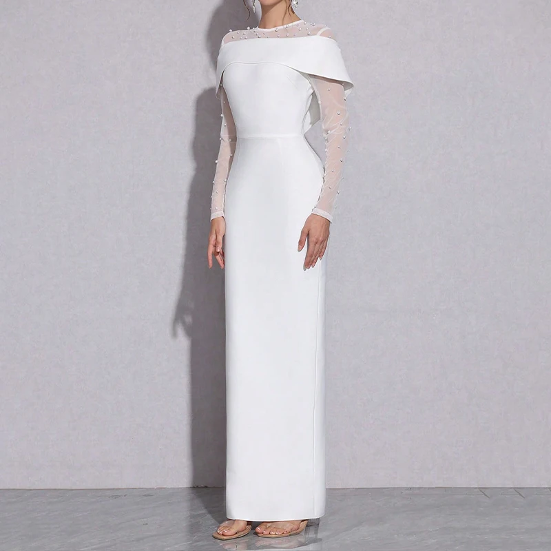 ZYHT 70052 Elegant Beads White Dresses Big Size Maxi Round Neck Wedding Guest Evening Luxury Long Sleeve Prom Dress for Women