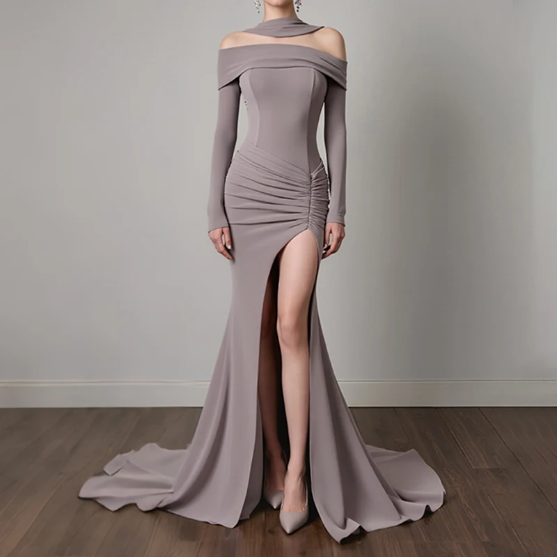 ZYHT 73905 Dusty Rose Off-The-Shoulder Long Sleeve Stretch Jersey Dress Ruched Bodice Floor Length Fish Tail Maxi Dress