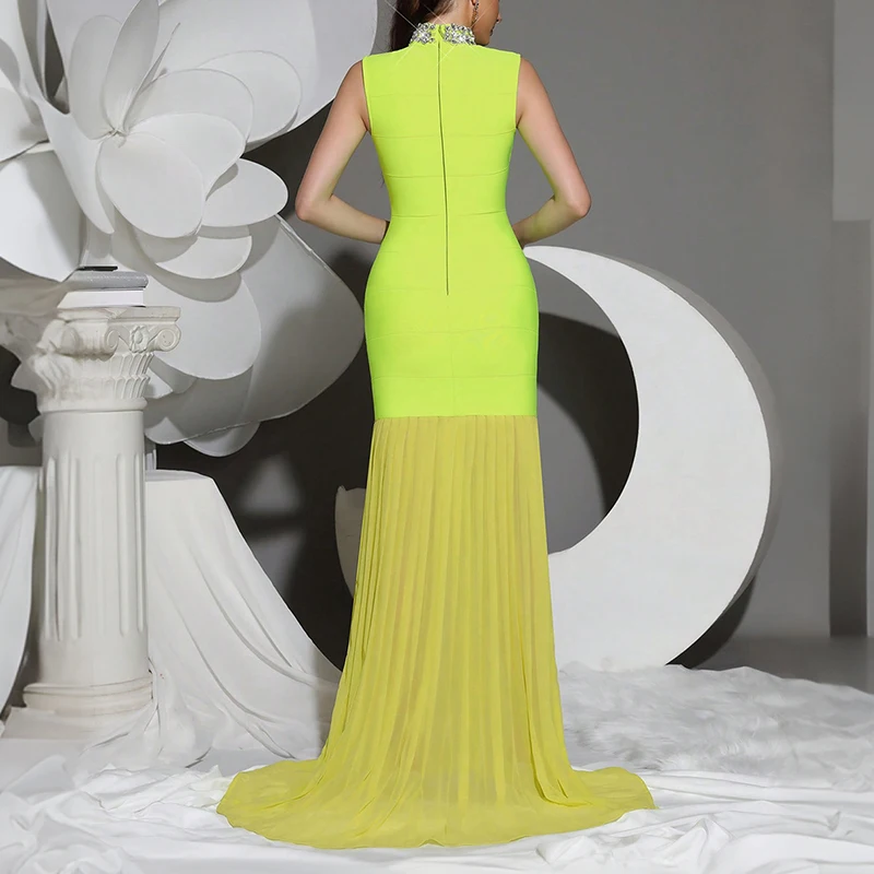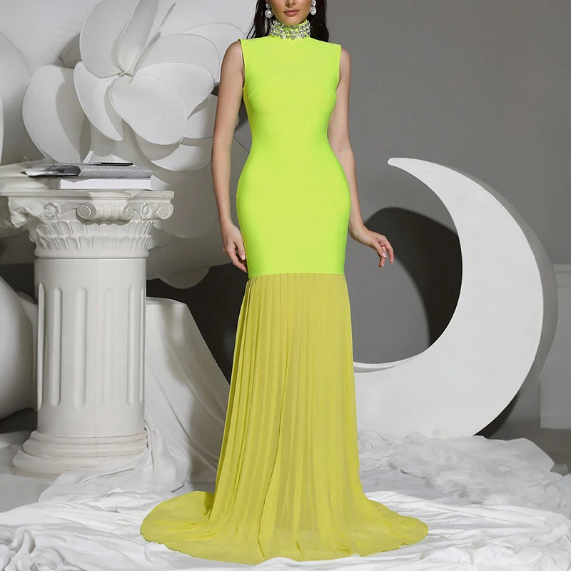 ZYHT 70045 Ladies Sleeveless Floor Length Pleated Mesh Bodycon Rhinestones Bridesmaid Dresses Plus Size Evening Dress for Women