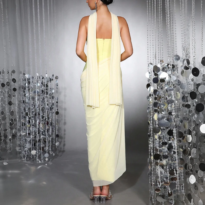 ZYHT 73907 Custom Design Long Sleeve High Neck Fashion Pleated Crystal Beads Ruched Knot High Slit Sexy Luxury Evening Dress