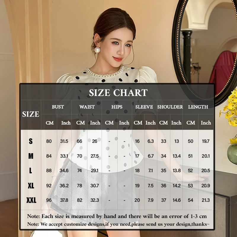 ZYHT 82069 Women's Tops and Blouses White Polka Dot Peplum Top with Pearl-Embellished Neckline Puff Short Sleeves