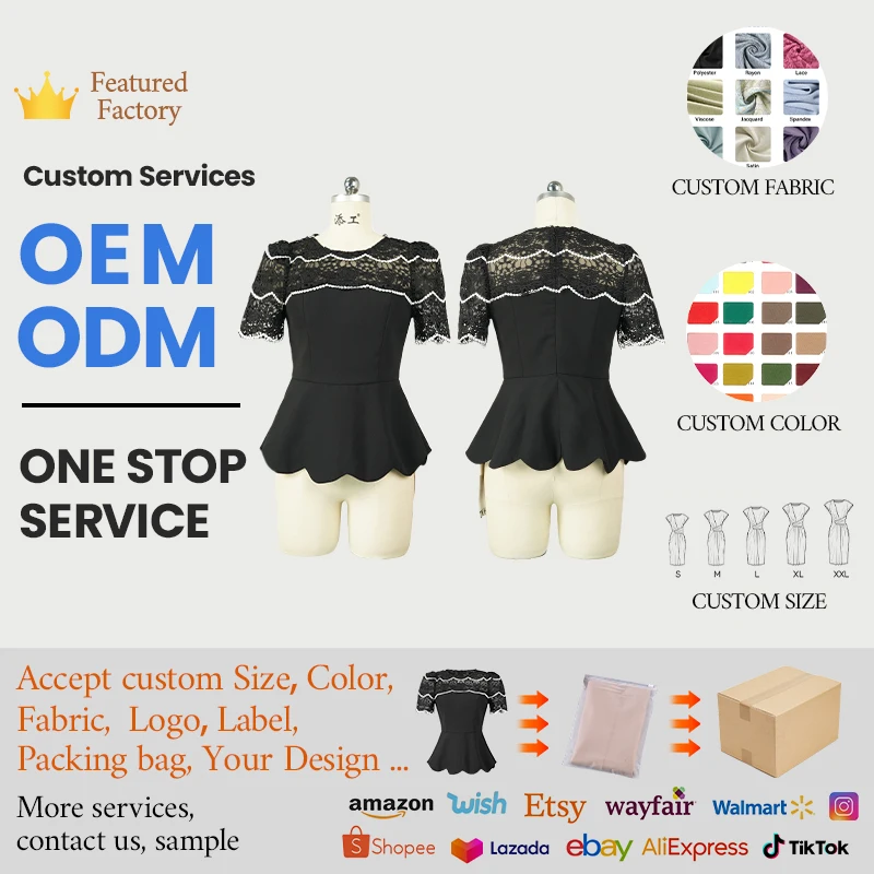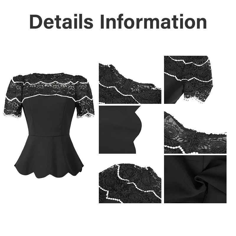 ZYHT 82055 Casual Summer Women's Black Peplum Top Blouse Contrast White Lace Scalloped Hem Puff Sleeves Fabric Floral Pattern