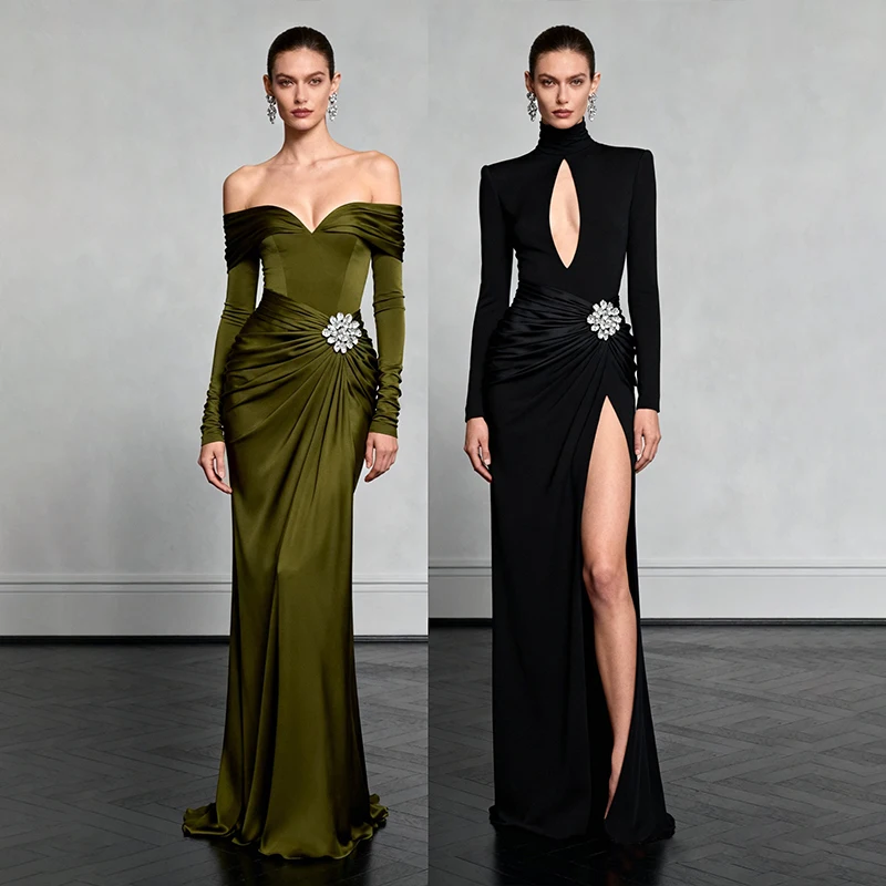 ZYHT 73907 Custom Design Long Sleeve High Neck Fashion Pleated Crystal Beads Ruched Knot High Slit Sexy Luxury Evening Dress