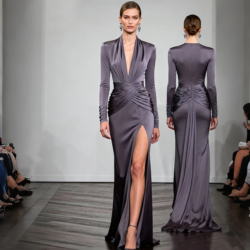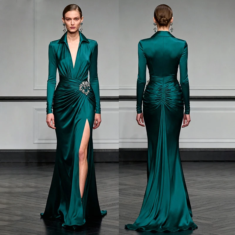 ZYHT 73907 Custom Design Long Sleeve High Neck Fashion Pleated Crystal Beads Ruched Knot High Slit Sexy Luxury Evening Dress