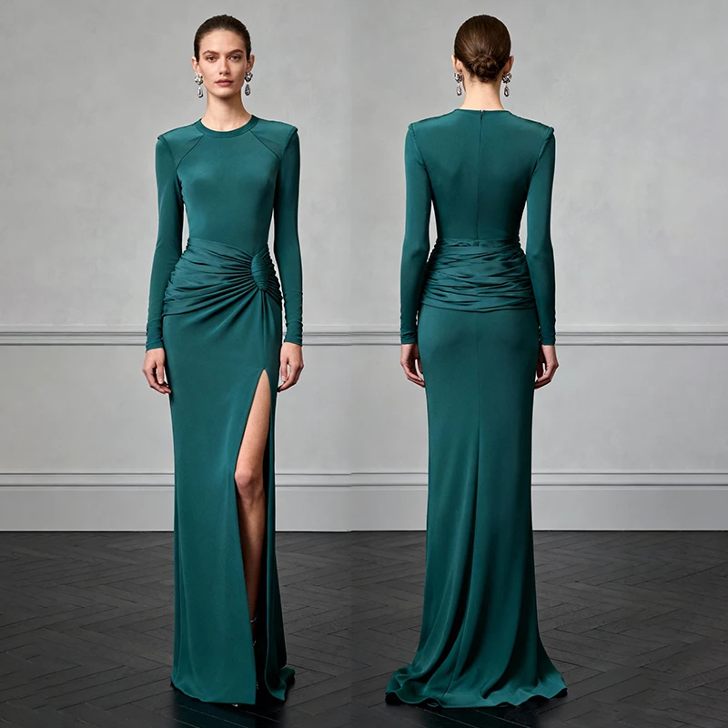 ZYHT 73902 Dark Green Blue Long Sleeve Simple Elegant Evening Dress Customize High End Women Clothing Manufacturer