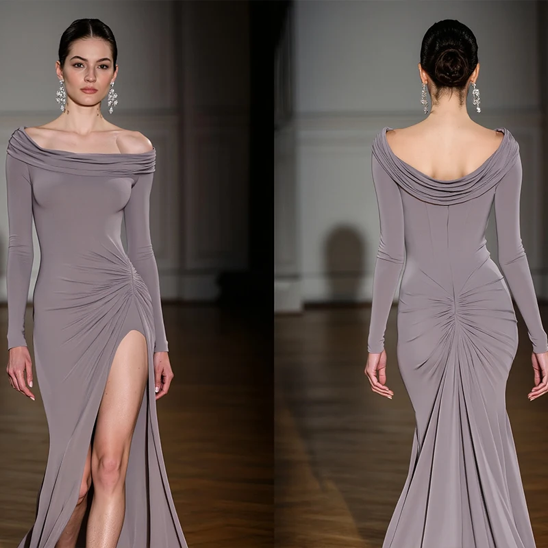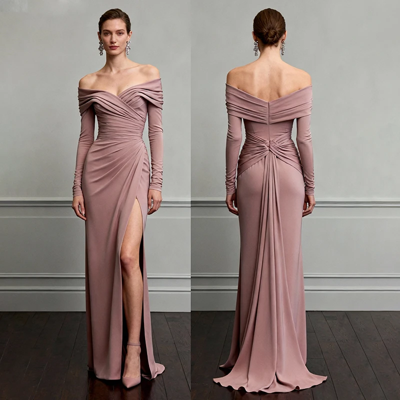 ZYHT 73905 Dusty Rose Off-The-Shoulder Long Sleeve Stretch Jersey Dress Ruched Bodice Floor Length Fish Tail Maxi Dress