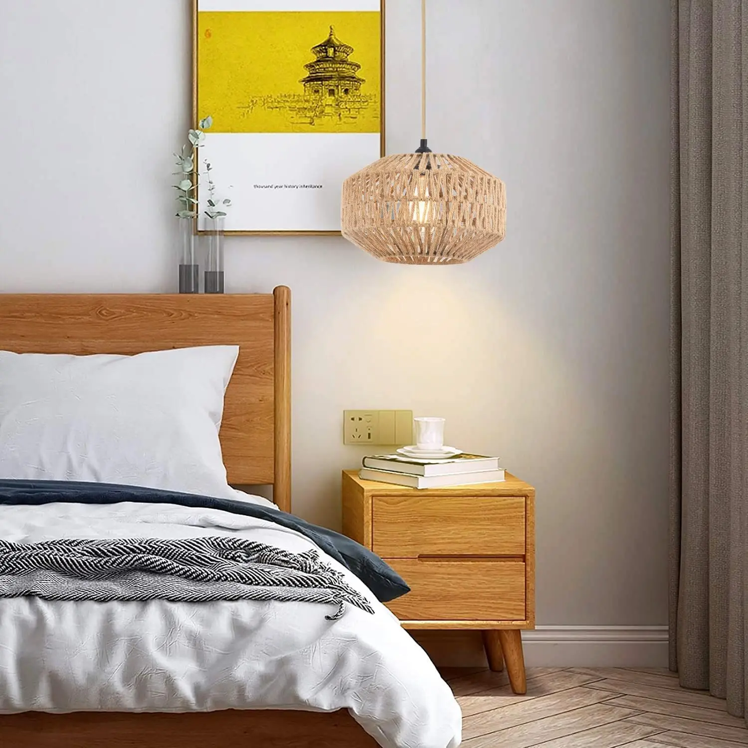Wabi-Sabi Handcrafted Tassel Macrame Woven Pendant Light Twine Braid Rattan Led Rattan Chandelier