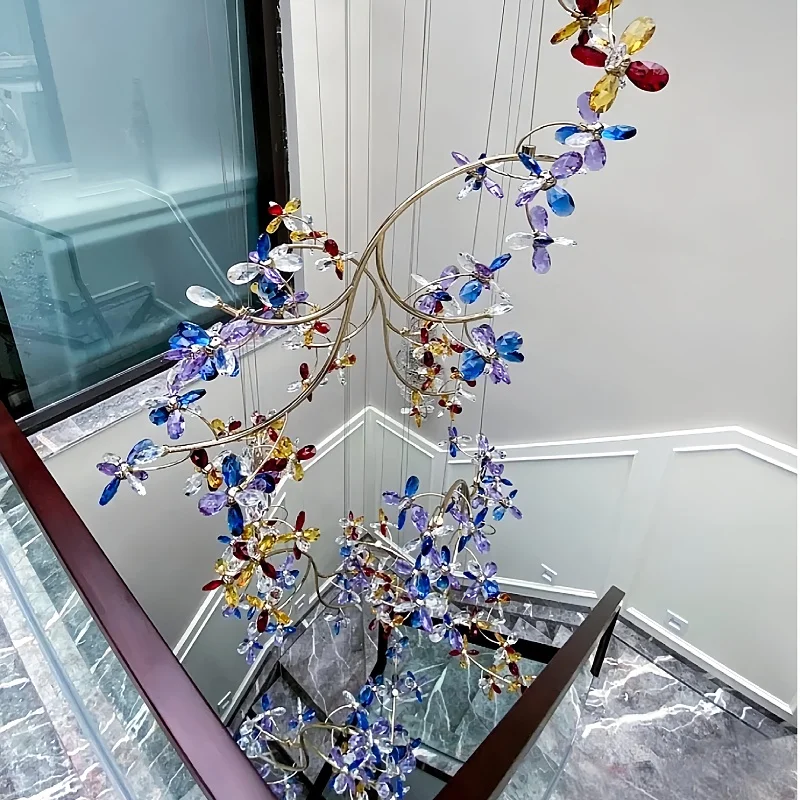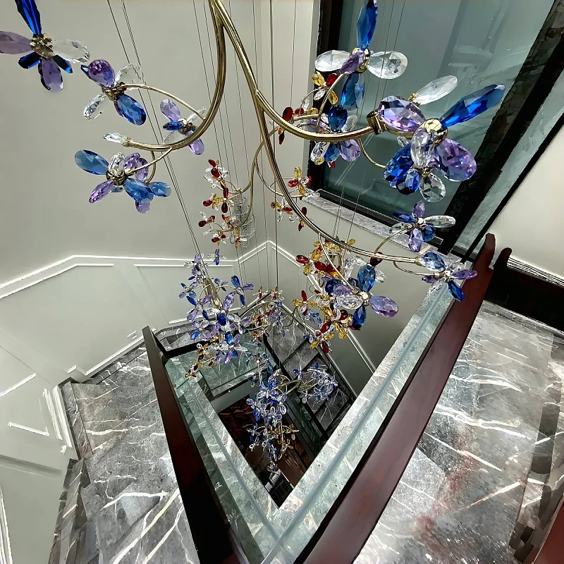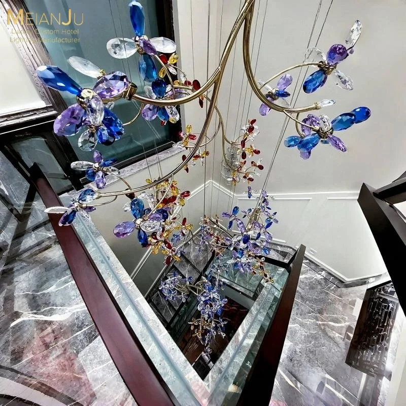 Custom High-Rise Duplex Crystal Petal Decorative LED Dimmable Luxury Villa Staircase Chandelier Glass Material Hanging Middle