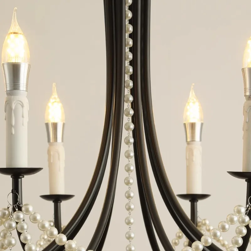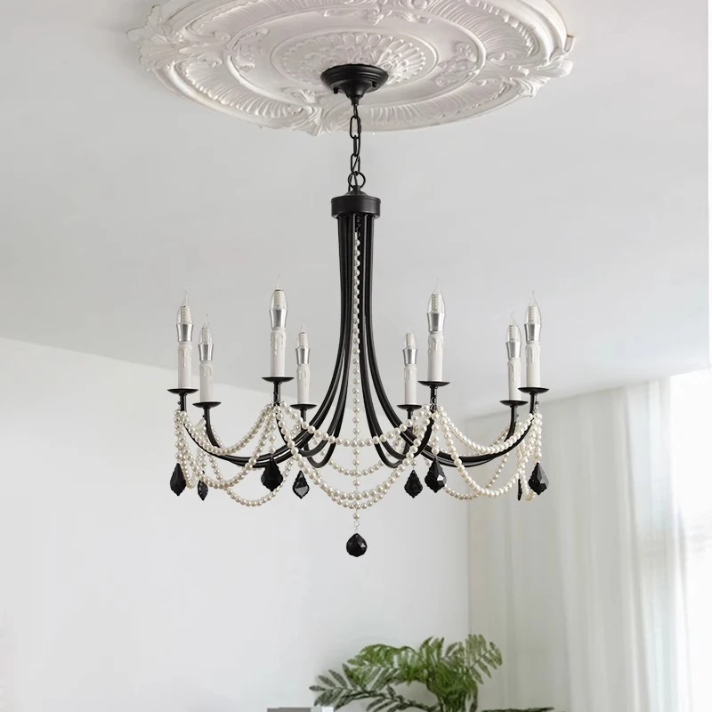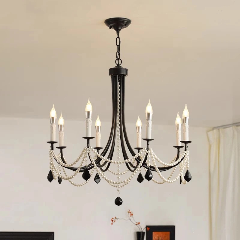 French Retro Crystal Chandelier American Black Pearl Adjustable Iron for Bedroom or Living Room with Middle AC Availability