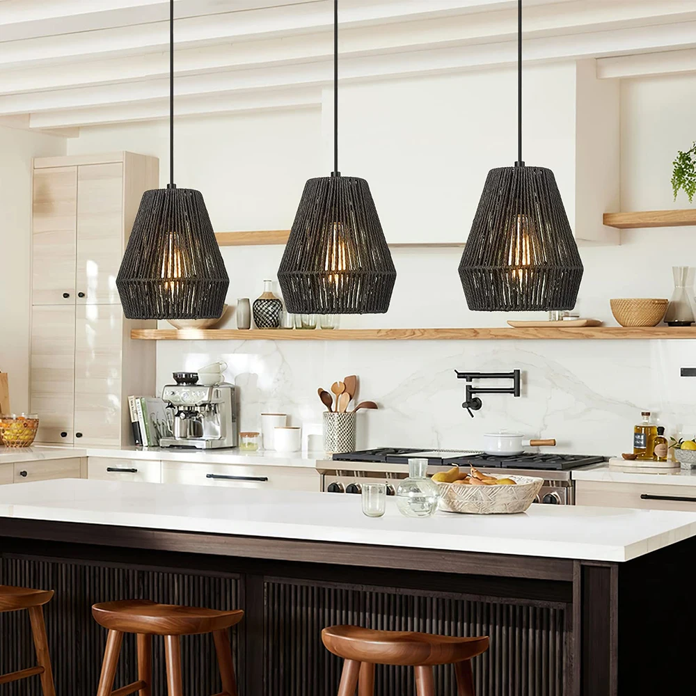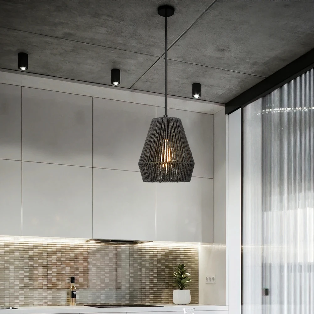 Wabi-Sabi Handcrafted Tassel Macrame Woven Pendant Light Twine Braid Rattan Led Rattan Chandelier