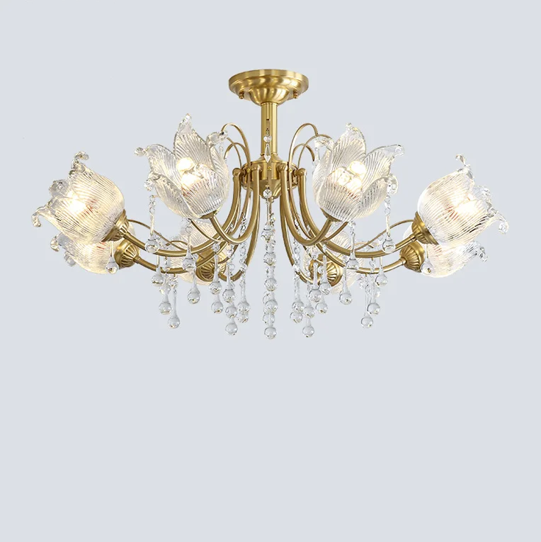 American Retro Crystal Flowers Vintage French Copper Brass Chandelier Flush Mount for Living Room
