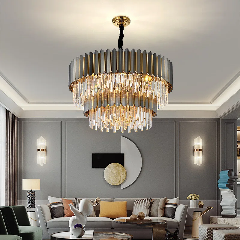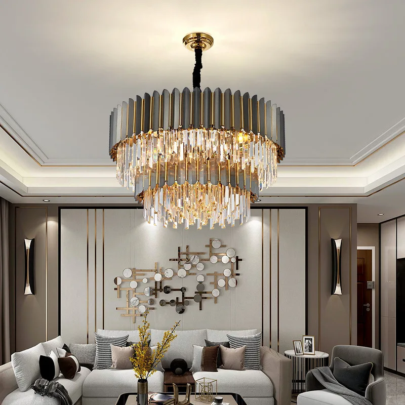 2 Layer Crystal Ceiling Light Black Round Modern Chandeliers Crystal for Living Room