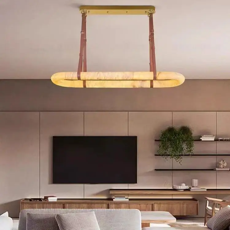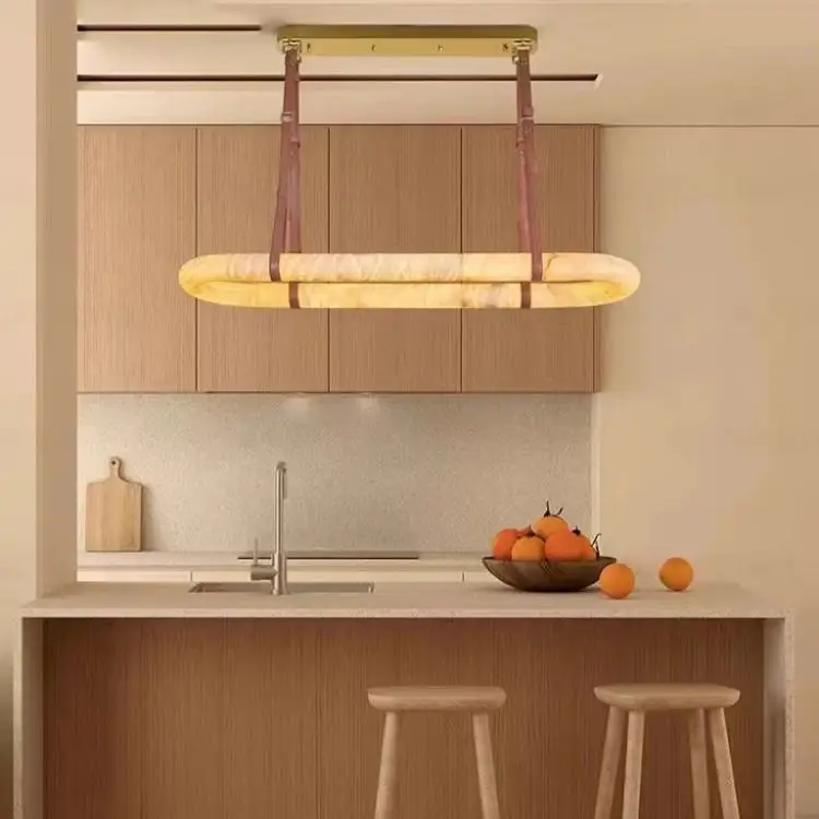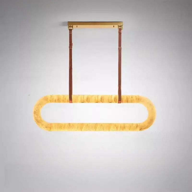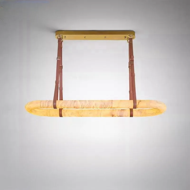 Modern Minimalist Leather Hanging Lamp Ring Marble Pendant Light Natural Alabaster Copper Chandelier