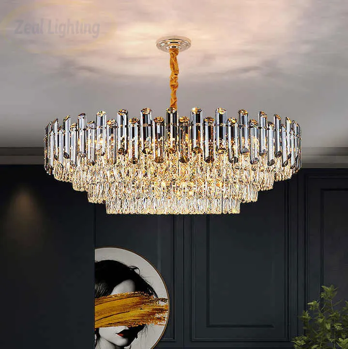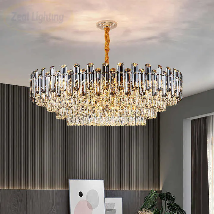 Adjustable Height Hanging Luxury Round Pendant Light Modern Ceiling K9 Crystal Chandeliers Fixture for Living Dining Room