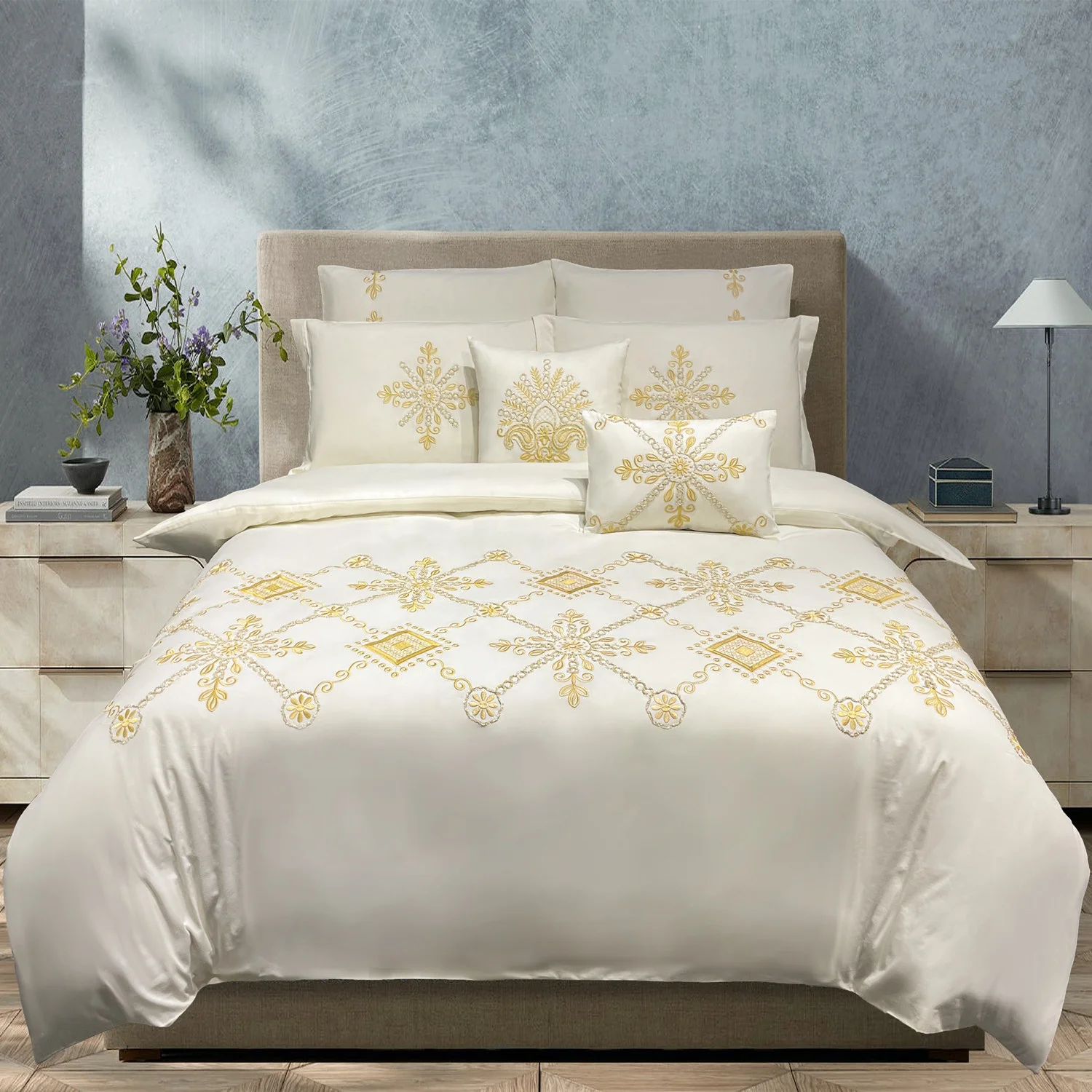 Microfiber embroidery comforter set luxury designer quilt bed set with embroidery design