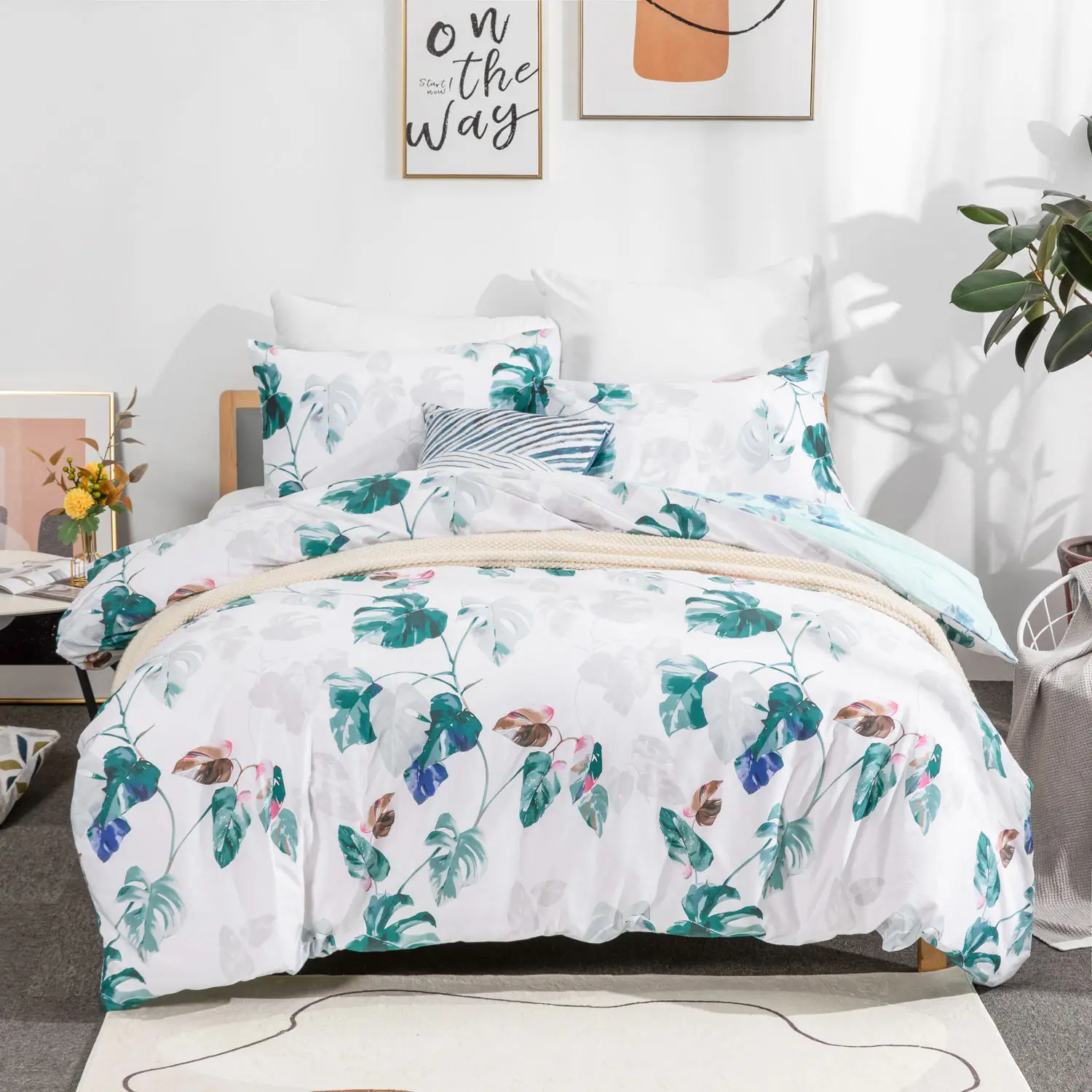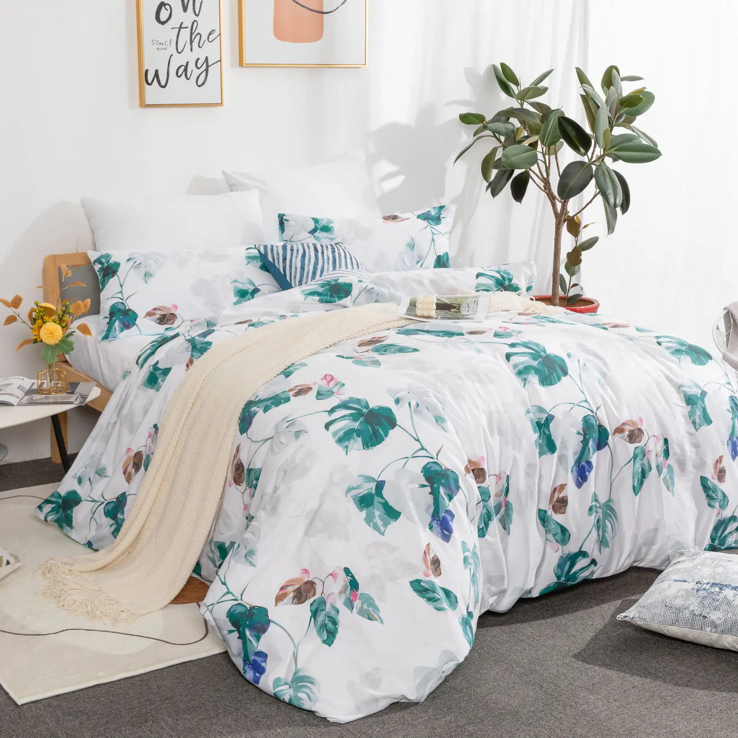 Wholesale Luxury Reversible Green Leaves Pattern Design Egyptian Cotton Duvet Cover Bedding Set