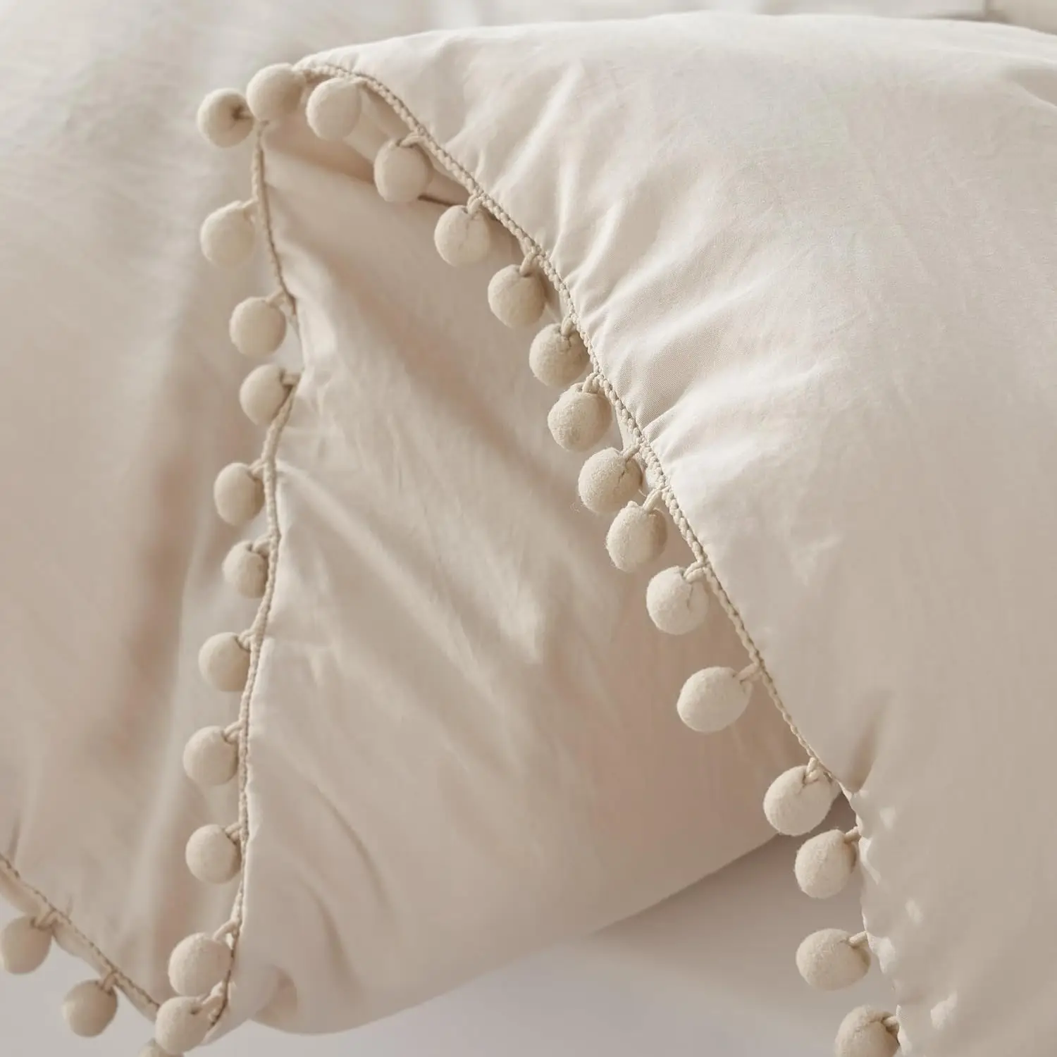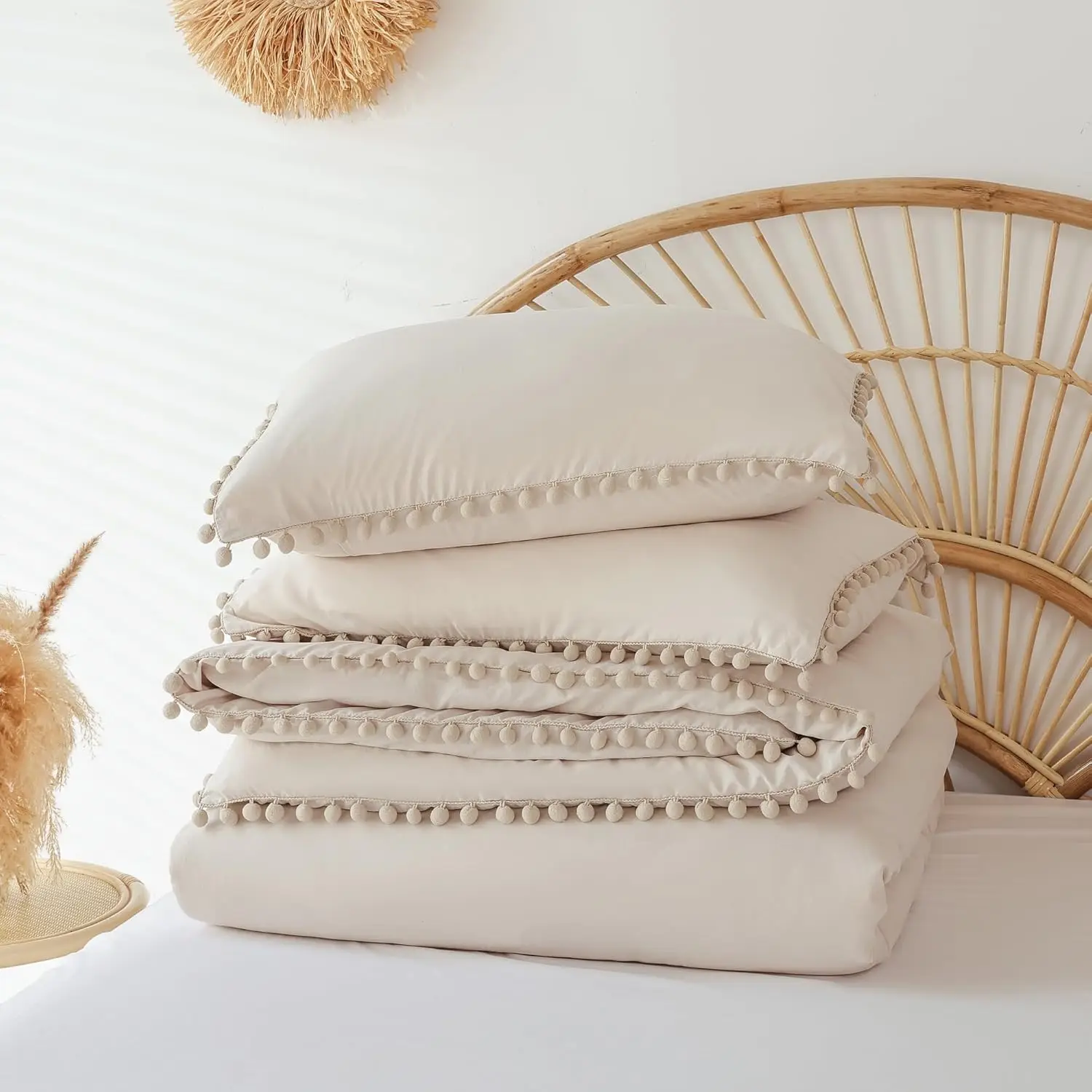 Microfiber Comforter Set, 3pcs Boho Ball Pom Fringe Design Bedding Set (1 Comforter, 2 Pillowcases)