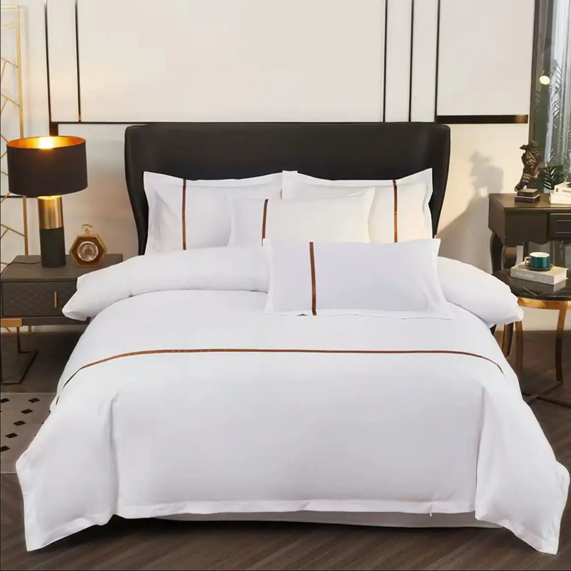 Luxury Embroidery Organic Eco Friendly Bedding Set Cotton 300TC Hotel Style Duvet Cover 4 Pcs Solid Soft Comfort Home