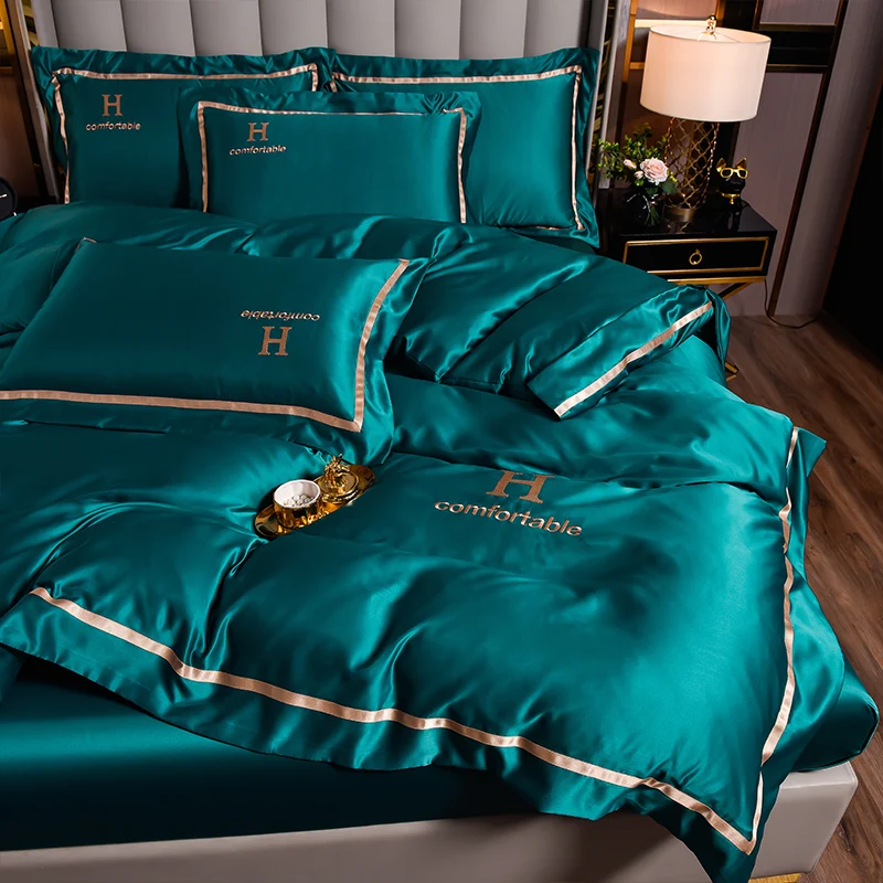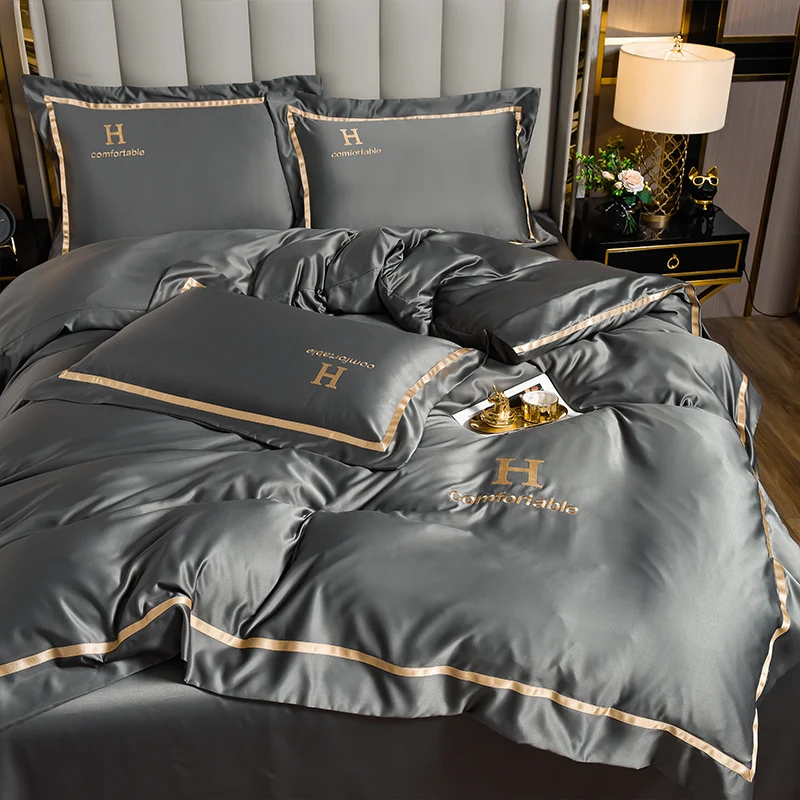 New Arrival Solid Color Washing Silk Bedding Set Applique Embroidery and Tribute Silk Duvet Cover Set