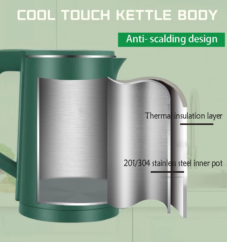 1.5L Green Double-Layer Electric Kettle 1500W Power with Ring Light and 201/304 Stainless Steel Inner Pot for Home Use