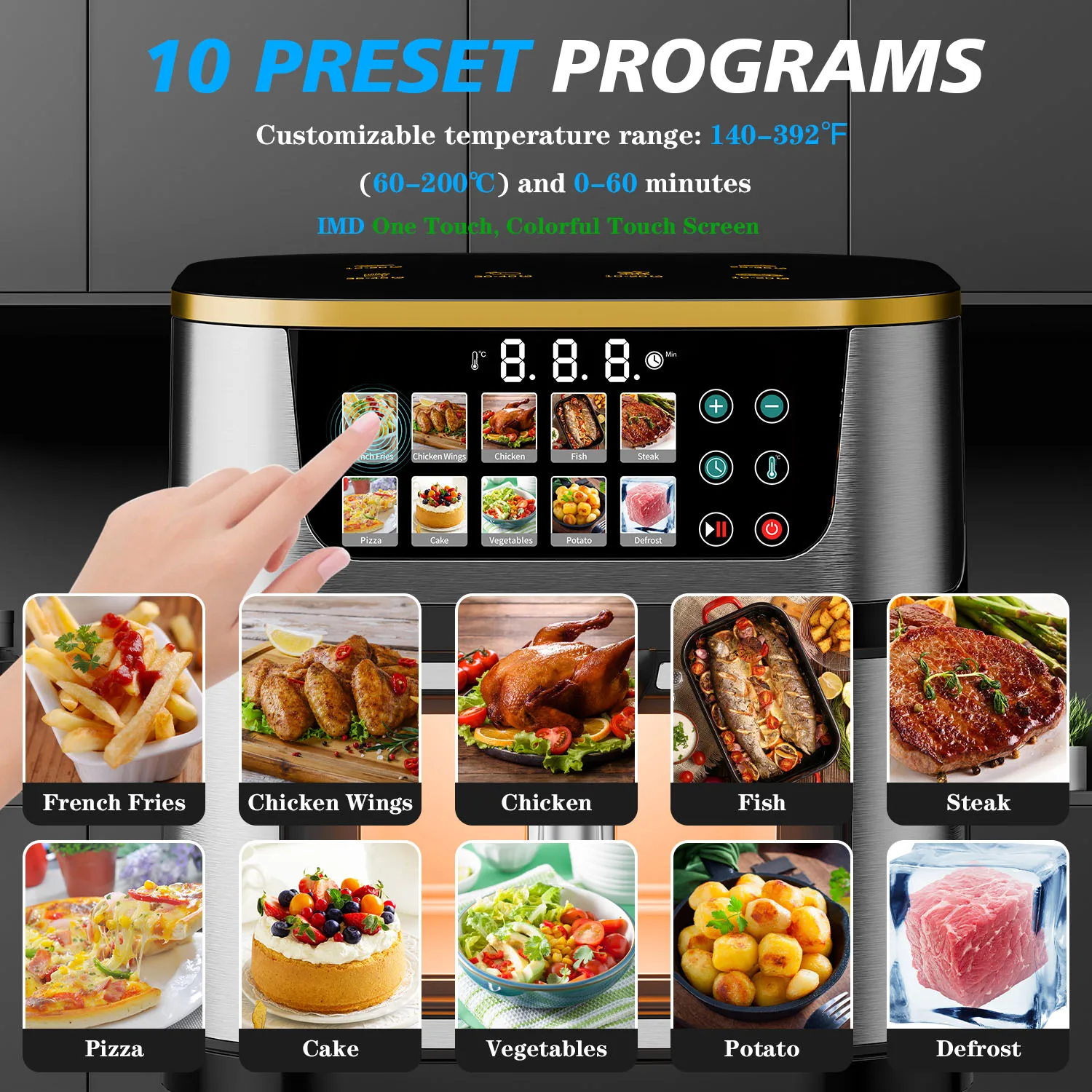 10L Classic Square Oil-Free Electric New Style 10-in-1 LCD Touch Screen Stainless Steel Air Fryer for Household Healthy Cooking