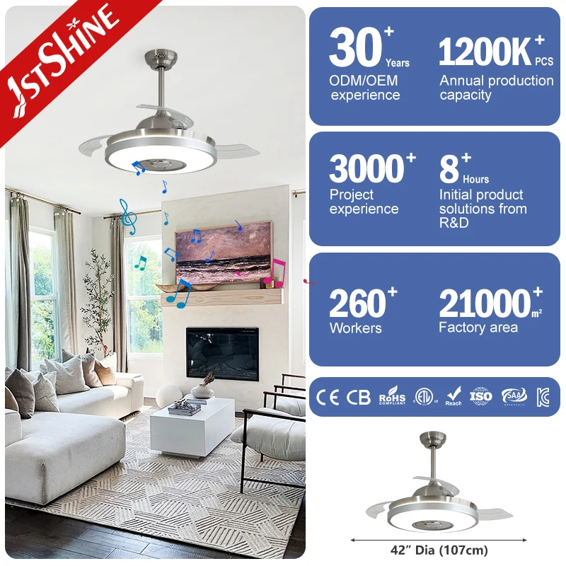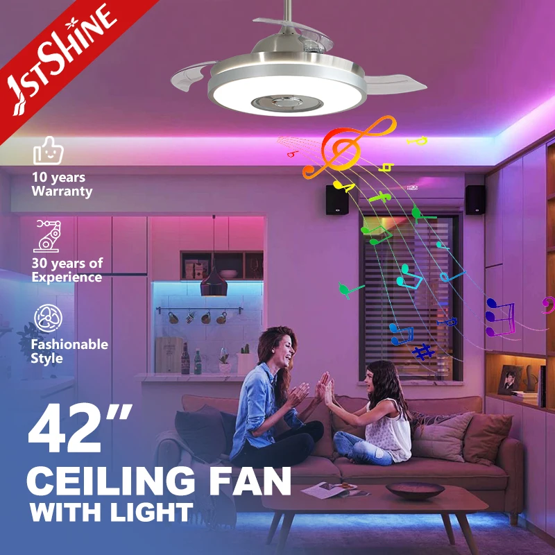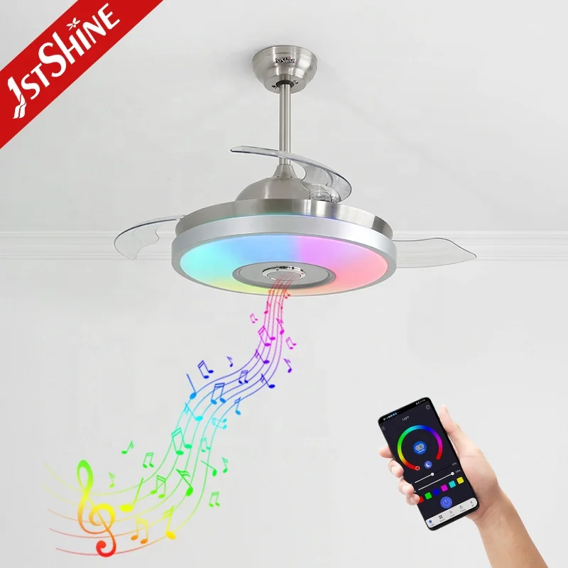1stshine LED Ceiling Fan Hot Selling HIFI Speaker Remote Control Smart Retractable Ceiling Fan with RGB Light