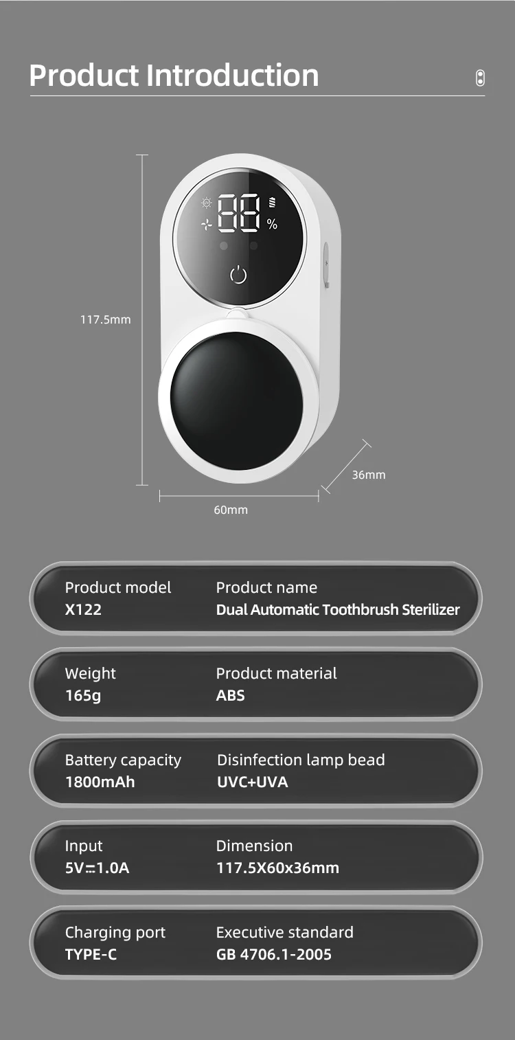 Wall Mounted Mini UV Toothbrush Sterilizer Wireless Rechargeable with Fan Dry Double Couple Design for Convenient Sanitizing