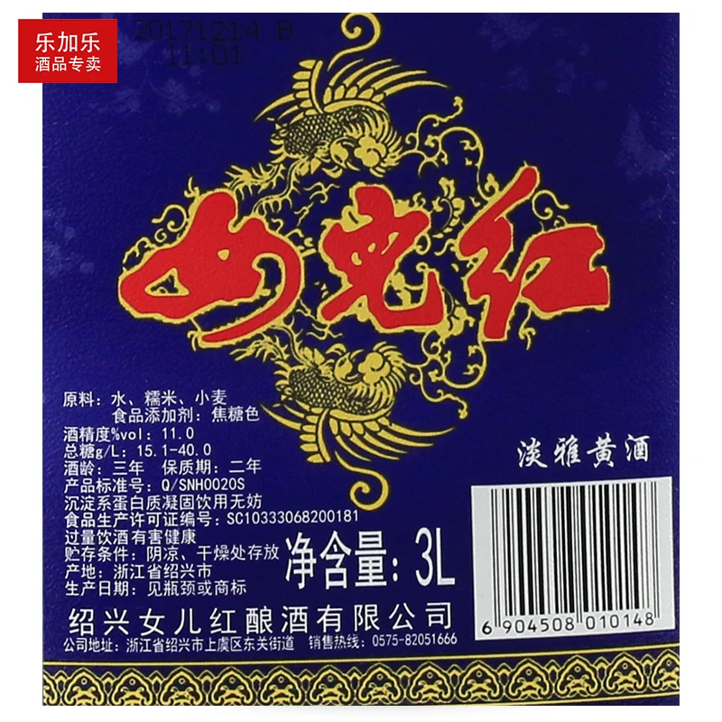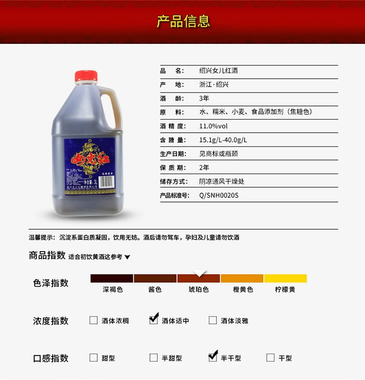 Shaoxing Daughter Red Three-year-old Glutinous Yellow Wine 3L*6 Case Semi-Dry Light Elegant 42% ABV T0 Grade