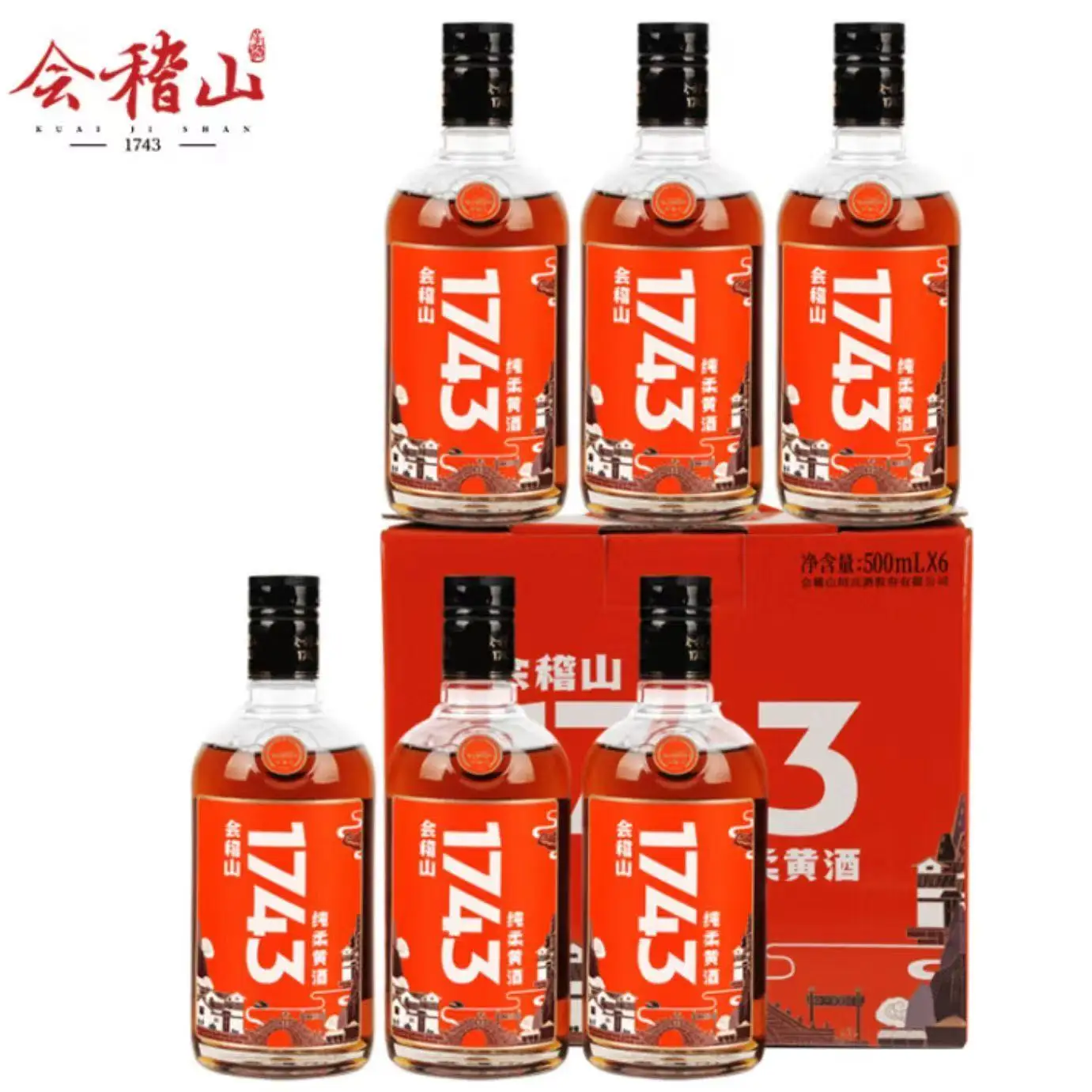 Kuaiji Mountain 1743 Yellow Wine 42% Alcohol 500ml*6 Bottles Boxed T0 Grade 9999 Days Shelf Life Jiangsu