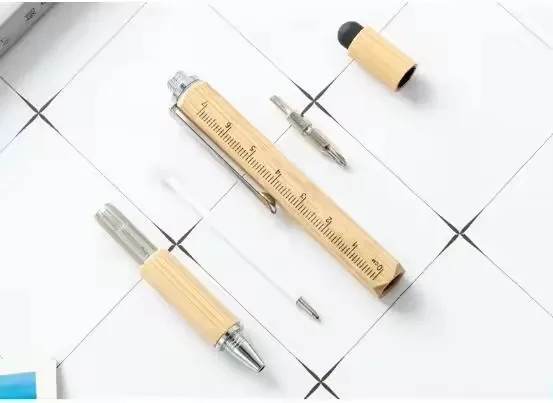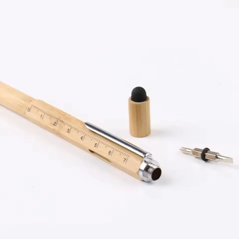 Eco-Friendly 7-in-1 Bamboo Multi-Functional Pen Portable Tool Ballpen with Screwdriver Ruler for Gift Usage