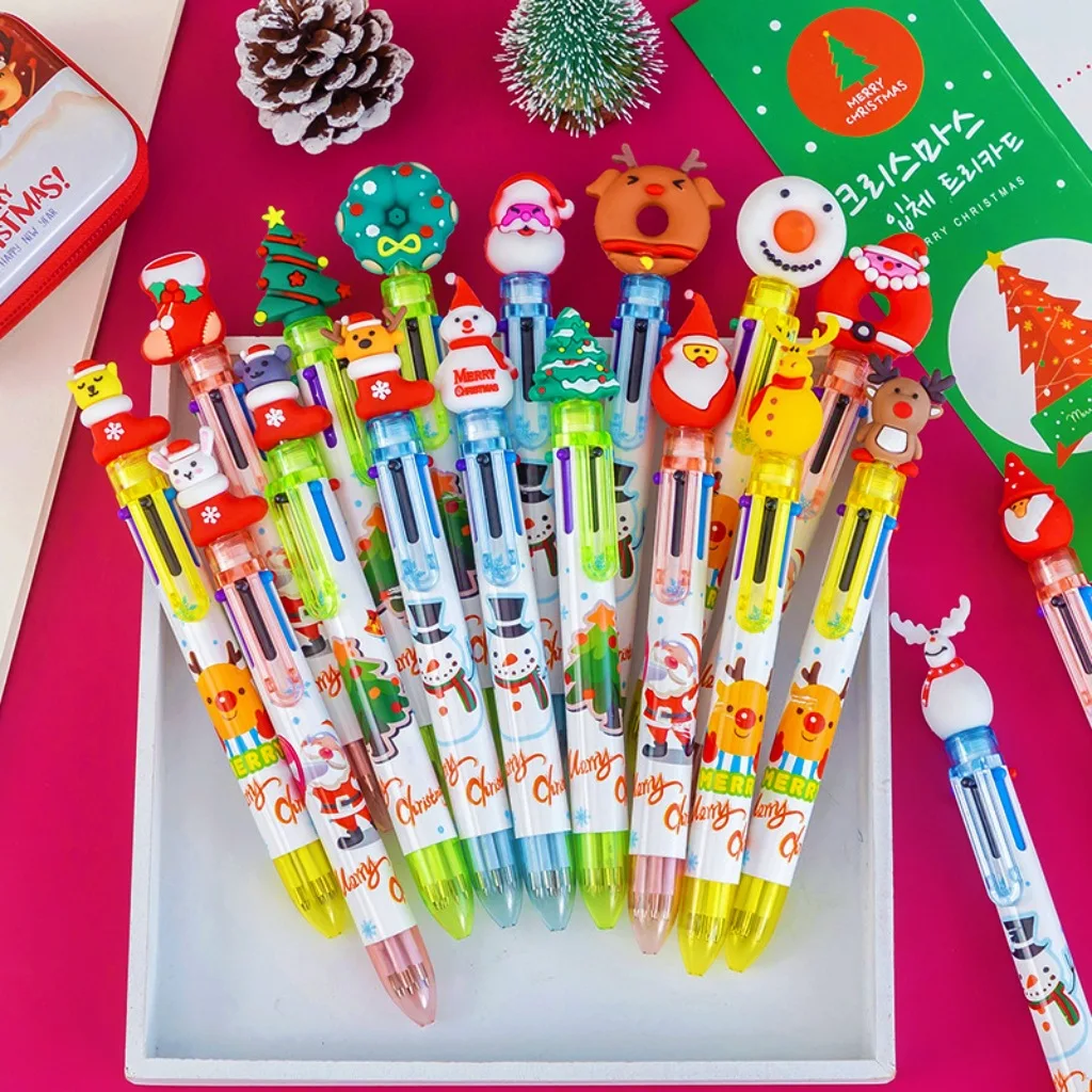 Six-Color Christmas Retractable Ballpoint Pen Cute Cartoon Christmas Tree Reindeer Design Plastic Gift