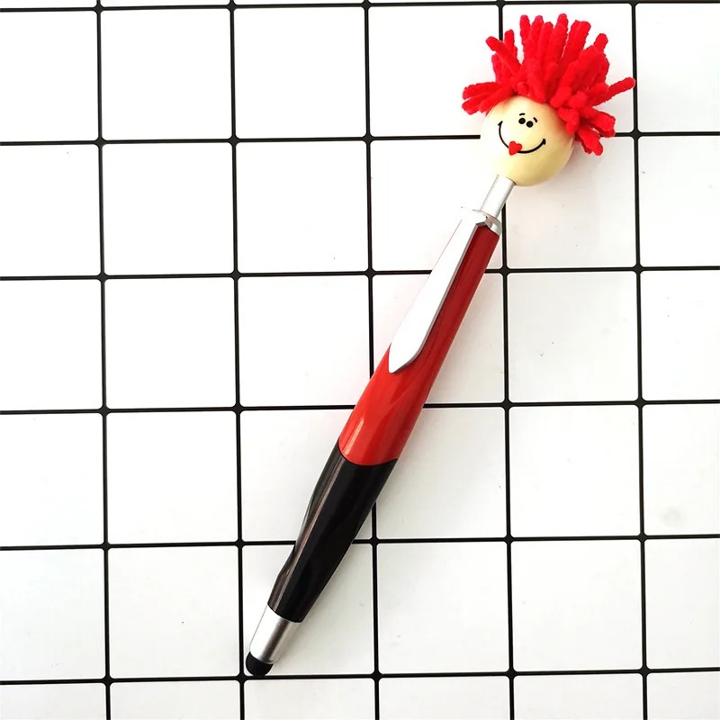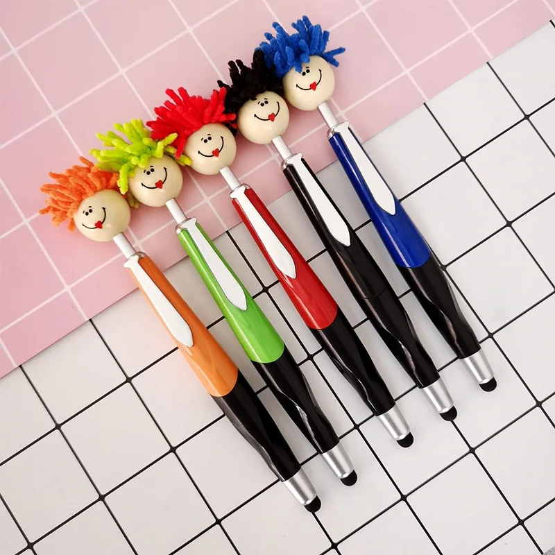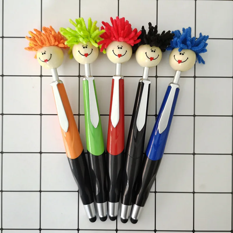 Custom Logo Printed 1.0mm Sports Ballpoint Pen Cute Cartoon Smile Face Cleaning Topper Mop Head Creative Plastic Plush Doll Cute