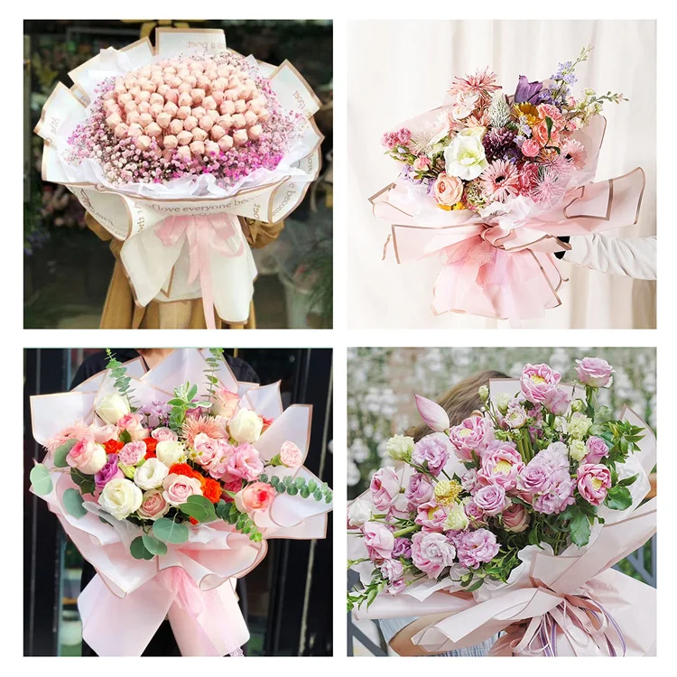 Custom Translucent Gold Edge Waterproof Floral Wrapping Paper Sheets Frosted Packaging Paper Satin Ribbon with Gold Border