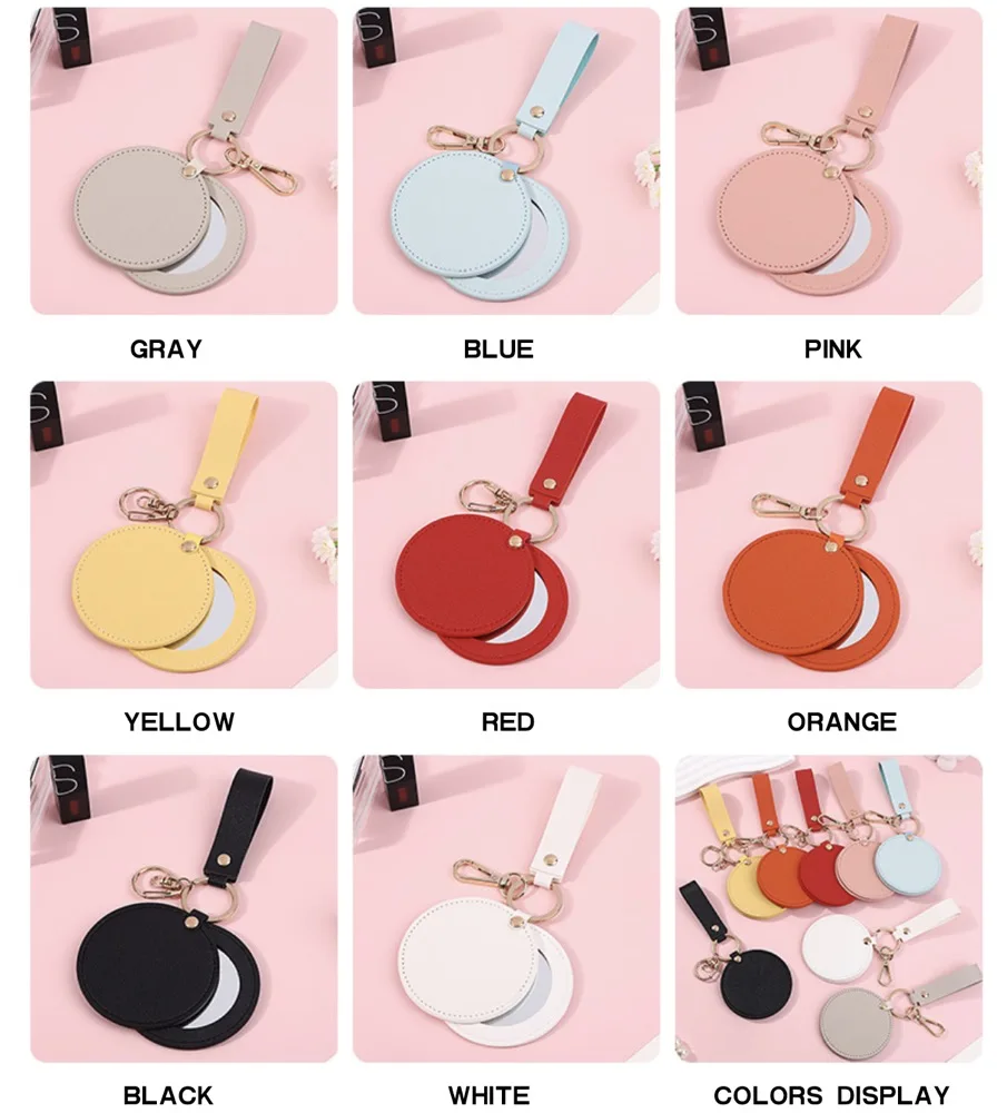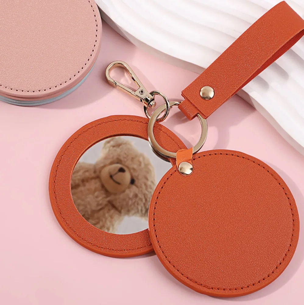 Custom Logo Print Low MOQ PU Leather Gift Keychain Durable Circle Keyring Promotion Gift Round Key Holders Beauty Mirror