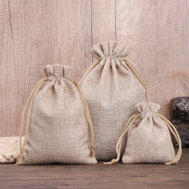 Custom Logo Print Solid Color Linen Packaging Bag Reusable Small Drawstring Jute Jewelry Pouch Wig Rings Gift Storage Gift Bags