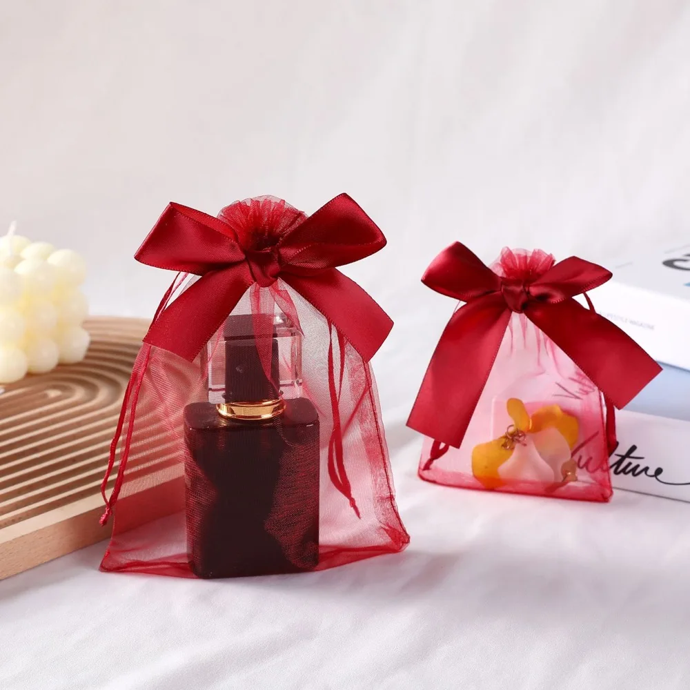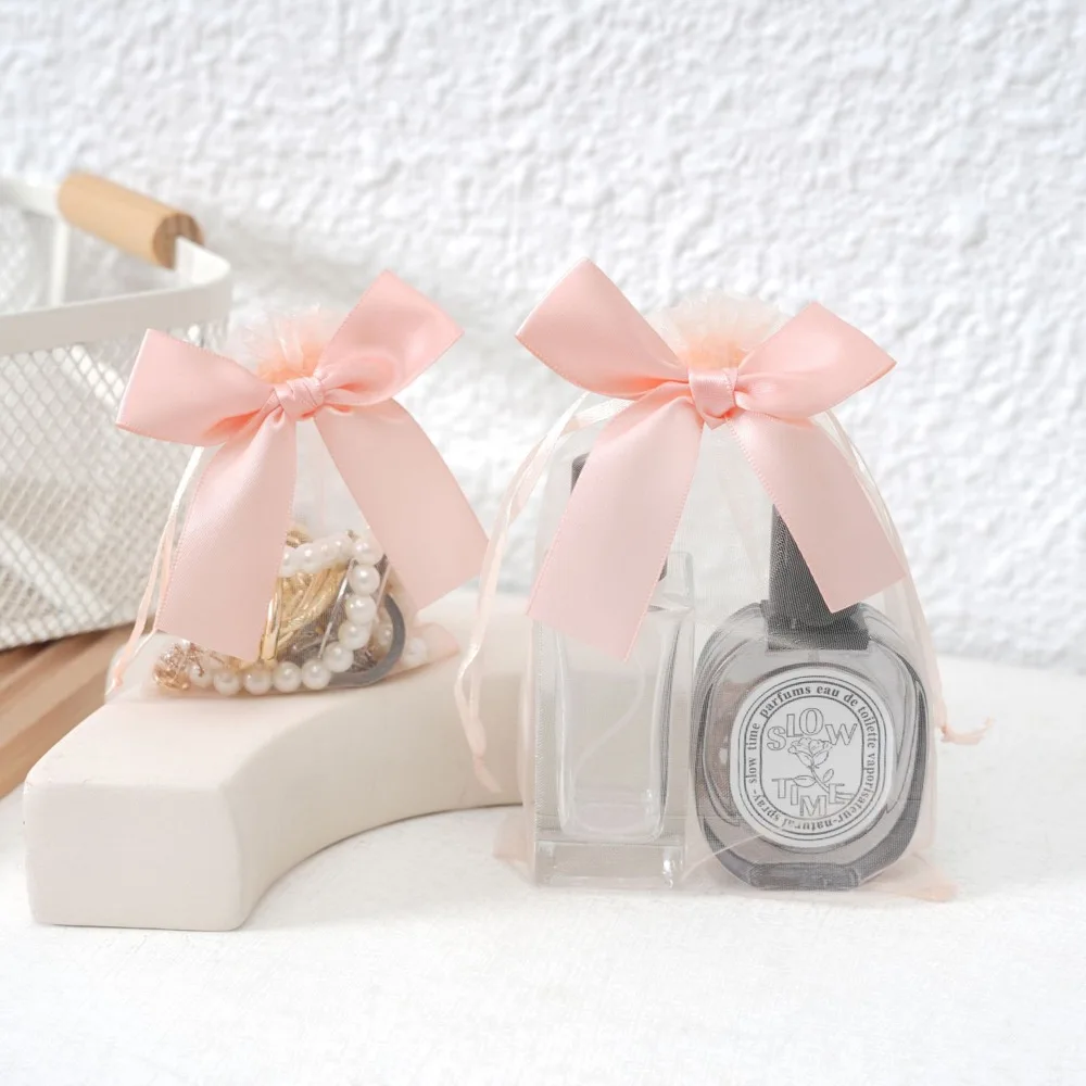 Custom Logo Print Transparent Organza Drawstring Gift Pouch Bow Jewelry Mesh Packaging Storage Bag Reusable Candy Gifts Pack