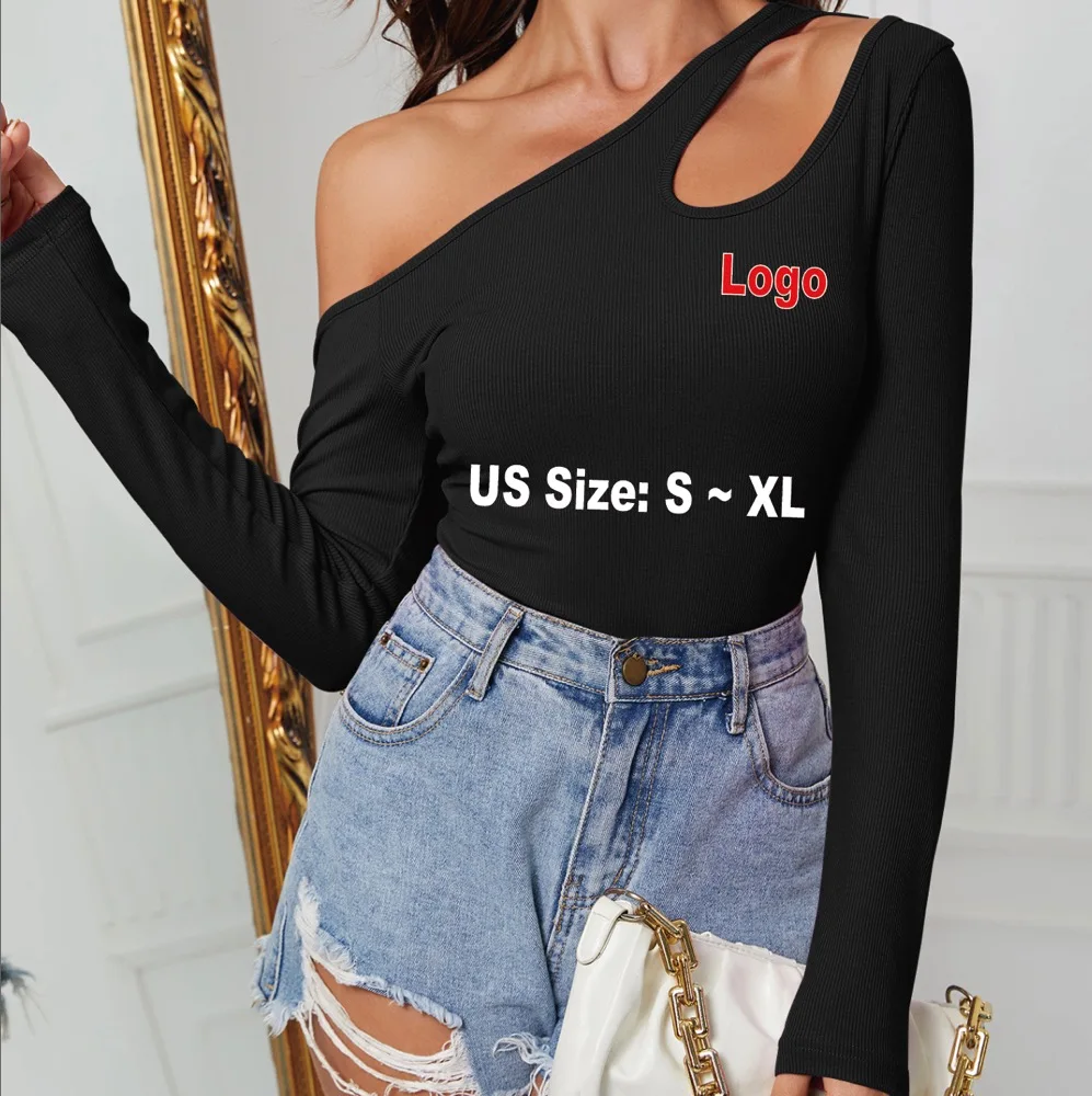 Custom Logo Print Women's Slanted Shoulder Long Sleeved Knitted T-shirt Solid Color Slim Fit Base Shirt Tops Casual Sports Wear