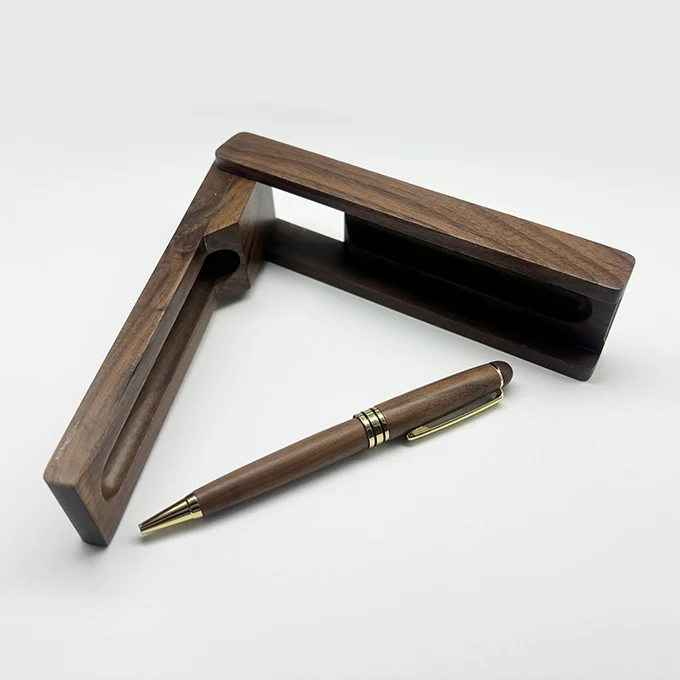 Wholesale Luxury Business Gift Walnut Wooden Ball Pen with Custom logo Engrave Promotion Wood Pen with Folding Stand Wood Box