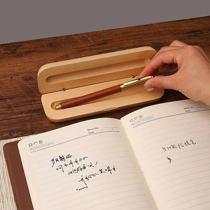 Custom Logo Luxury Eco-Friendly Brass Wood Roller Ball Gel Pen Christmas Gift with Folding Pen Case Stand