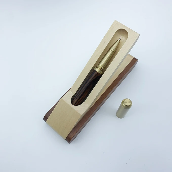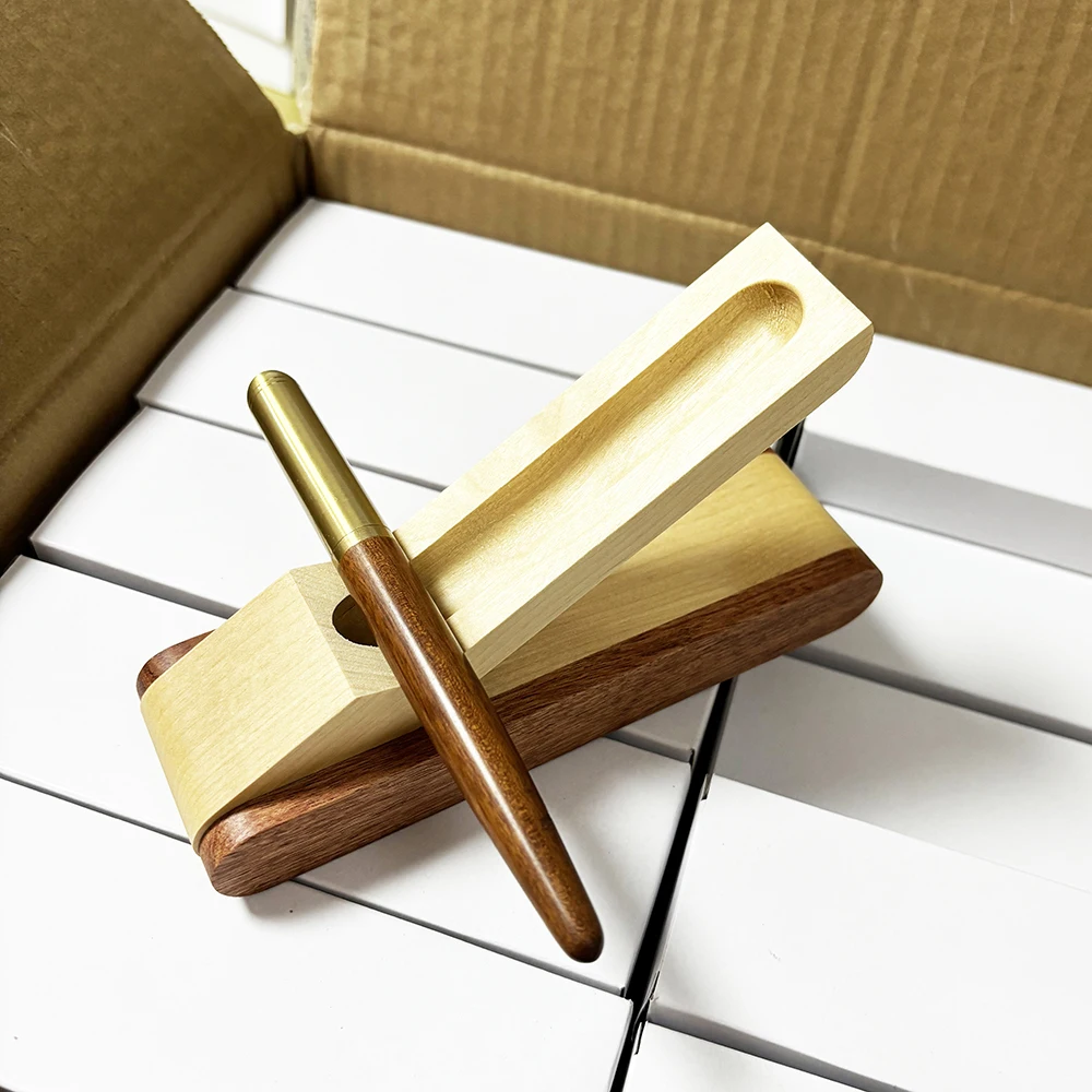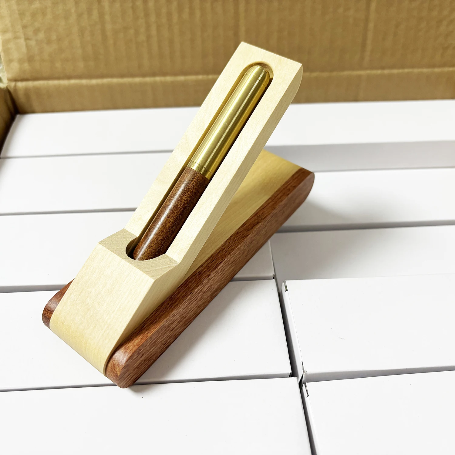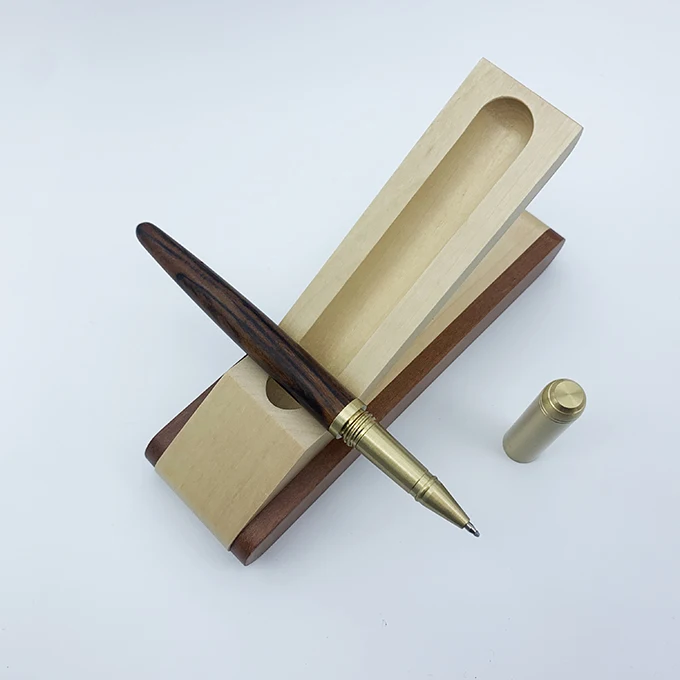 Custom Logo Gift Premium ECO Friendly Brass Wood Roller Ball Pen Stationery with Wood Box Stand