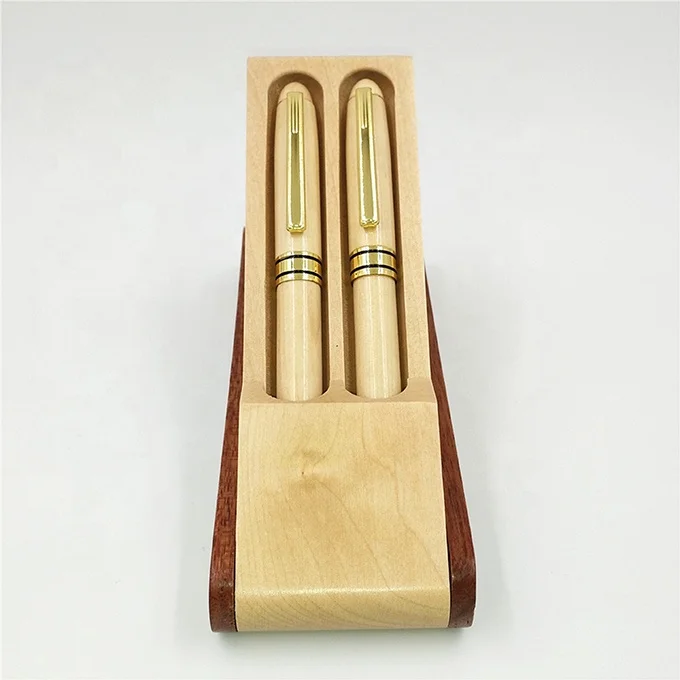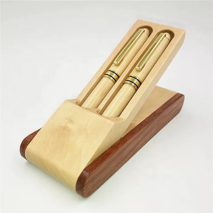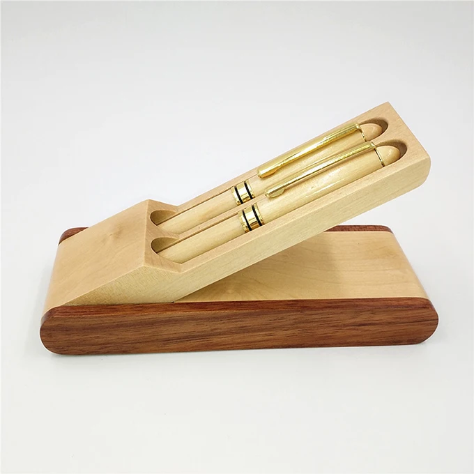 Luxury Gift Set Blank Double Wooden Ballpoint Pens with Wooden Folding Case Office Pen Holder