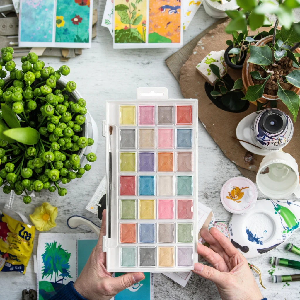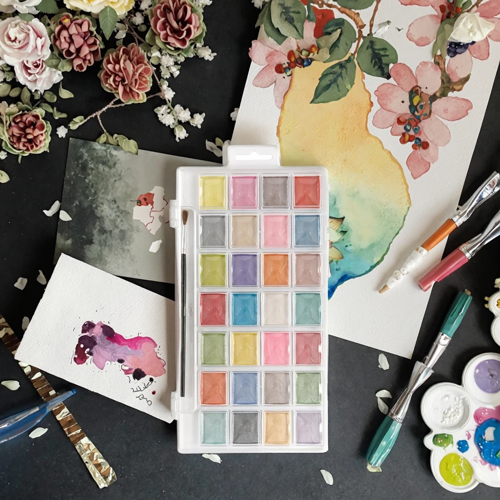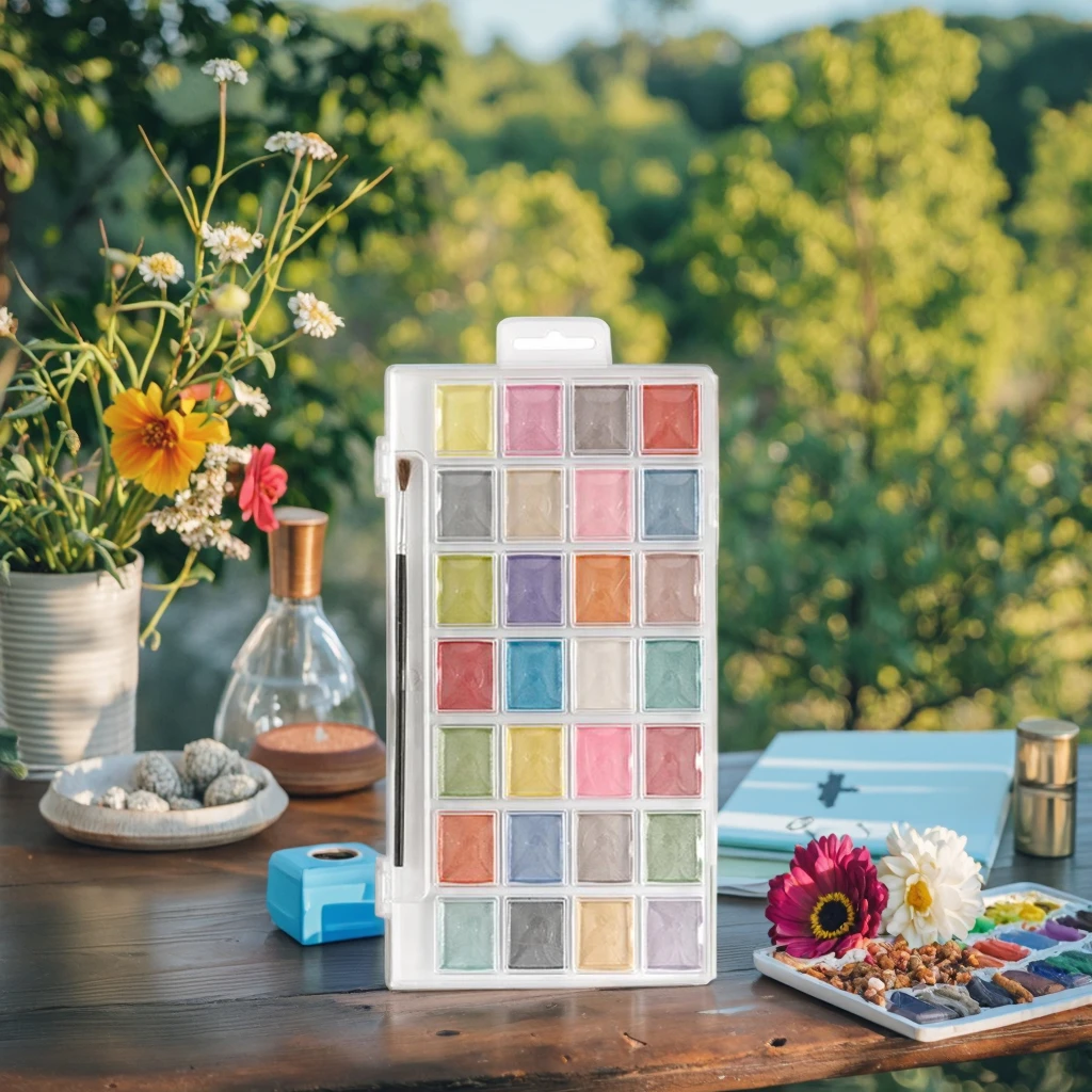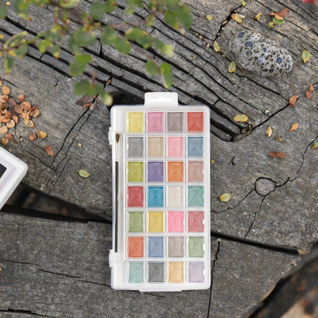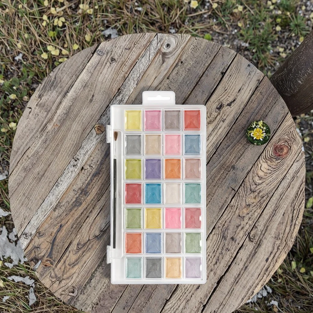 Metallic Watercolor Pan Set with 28 Unique Shades & Paint Brush Pearlescent Colors for Drawing on Canvas & Glass