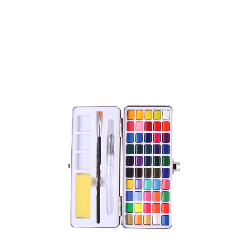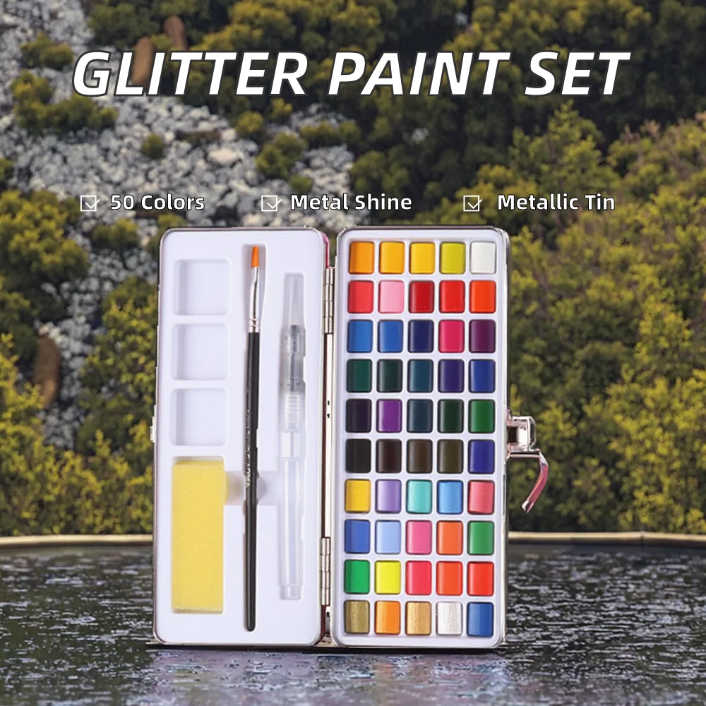Giorgione Solid Glitter Metallic Watercolor Paint Set for Beginners Tin Box with Water Nylon Hair Brush Paper Painting 50 Colors