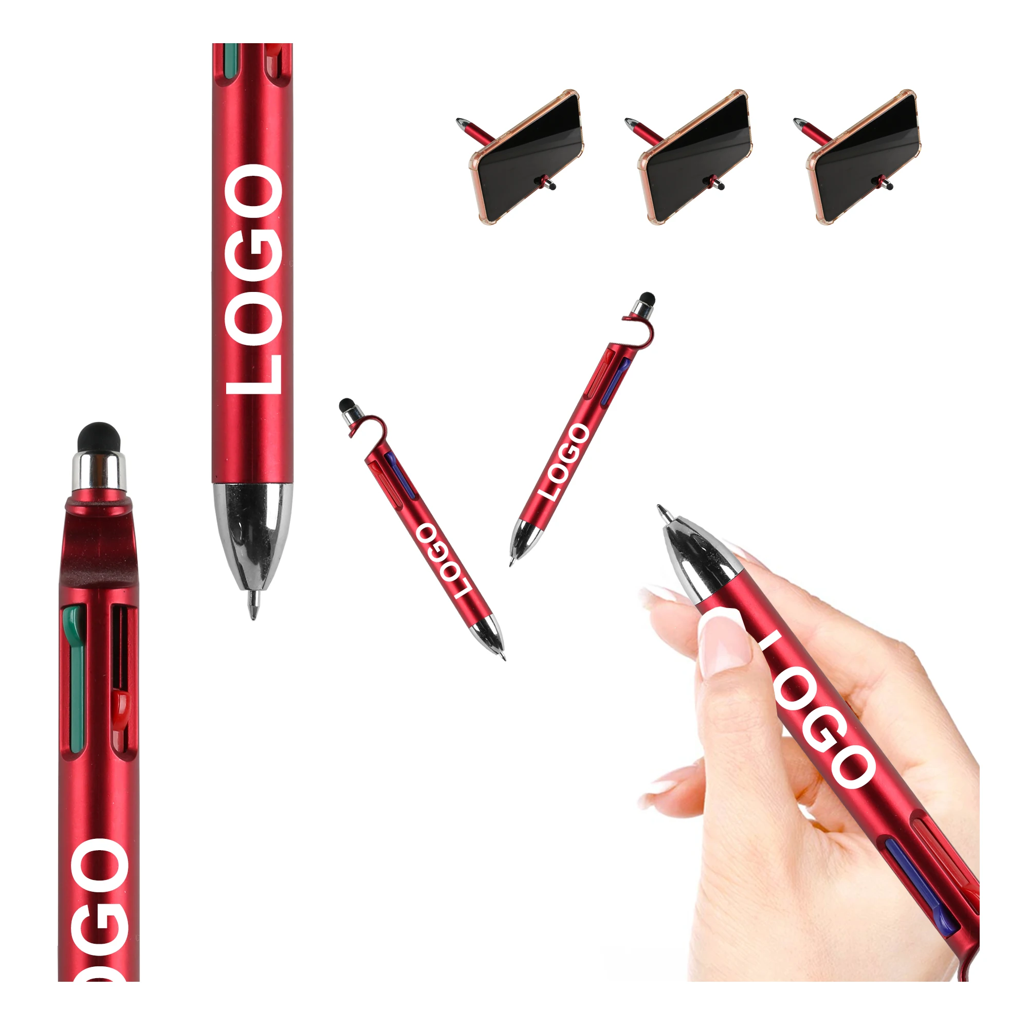 New Creative 3 in 1 Customized Plastic Ballpoint Pen with Custom Logo Print for Phone Holder 4 Refills Ball Pens Touch Stylus