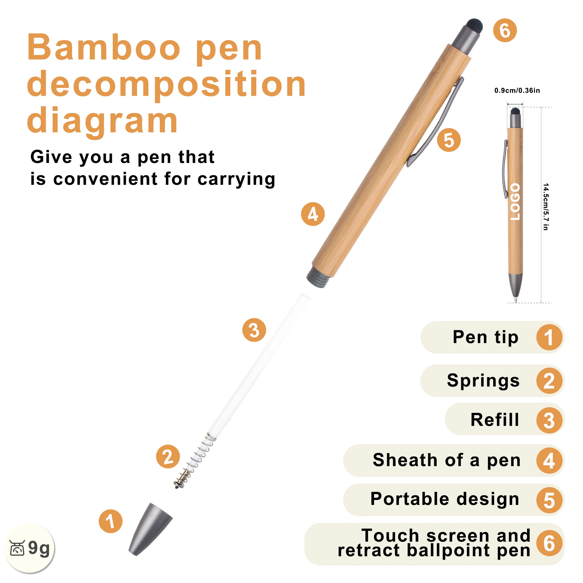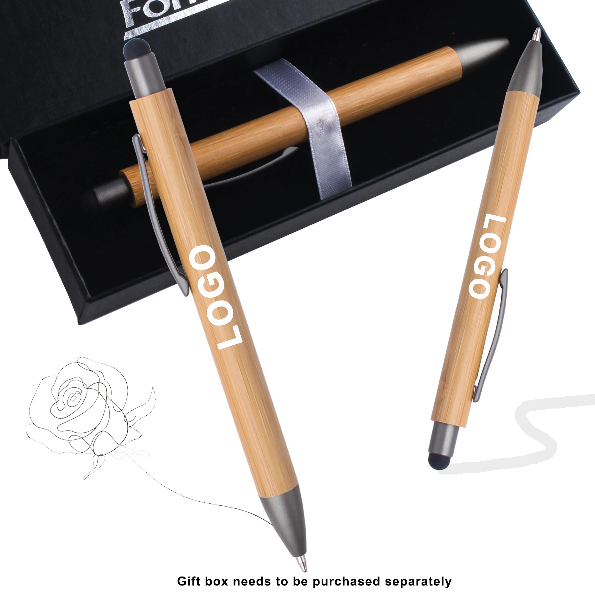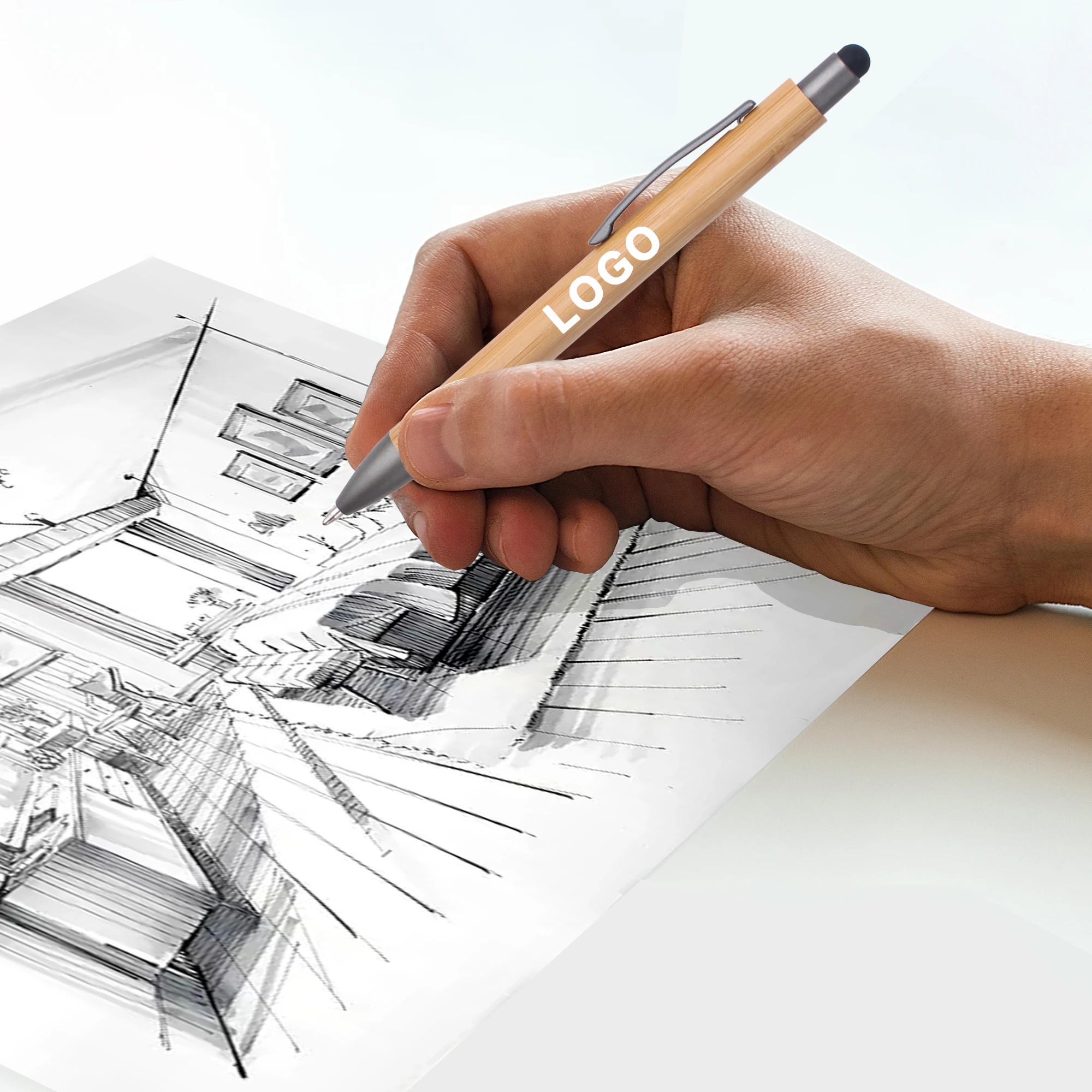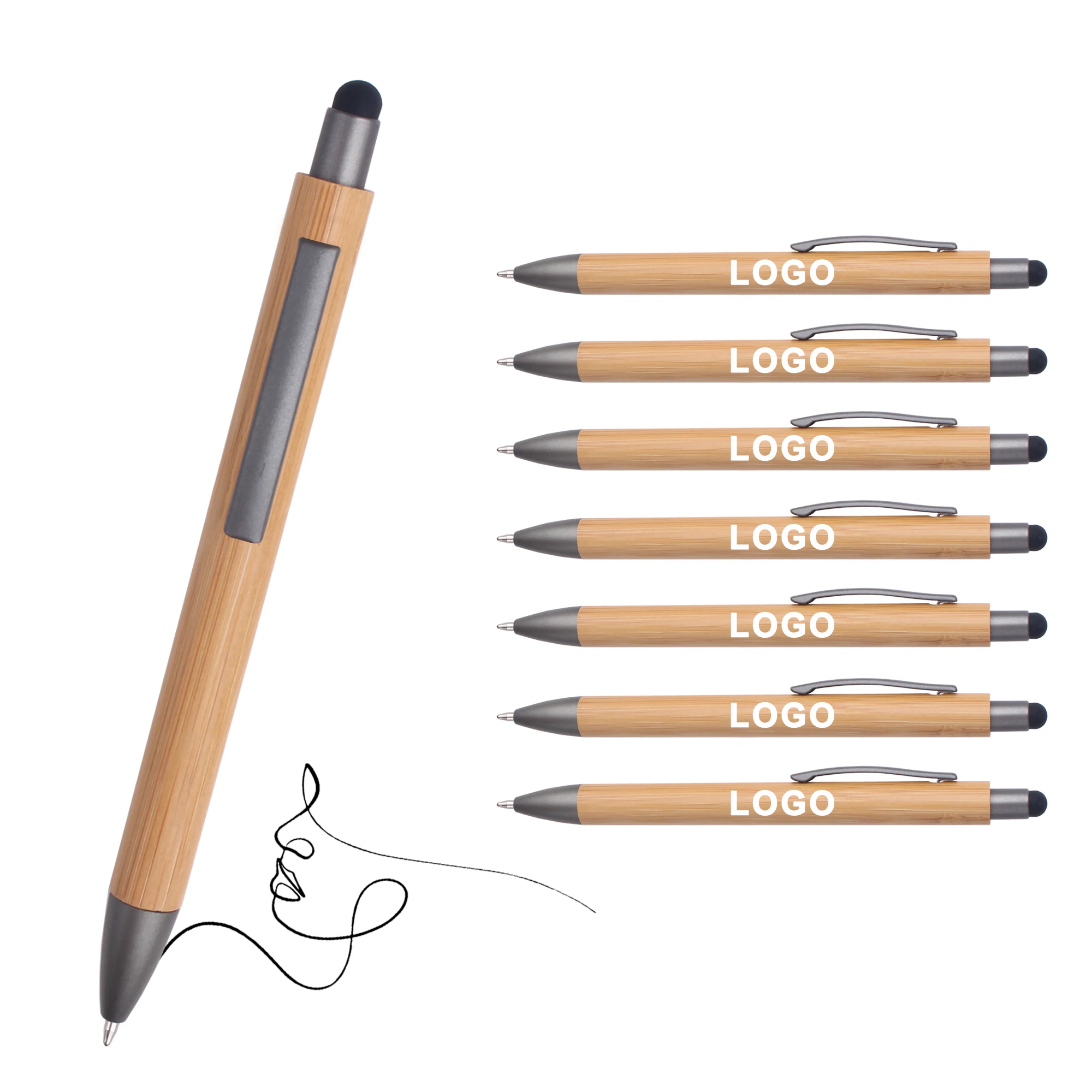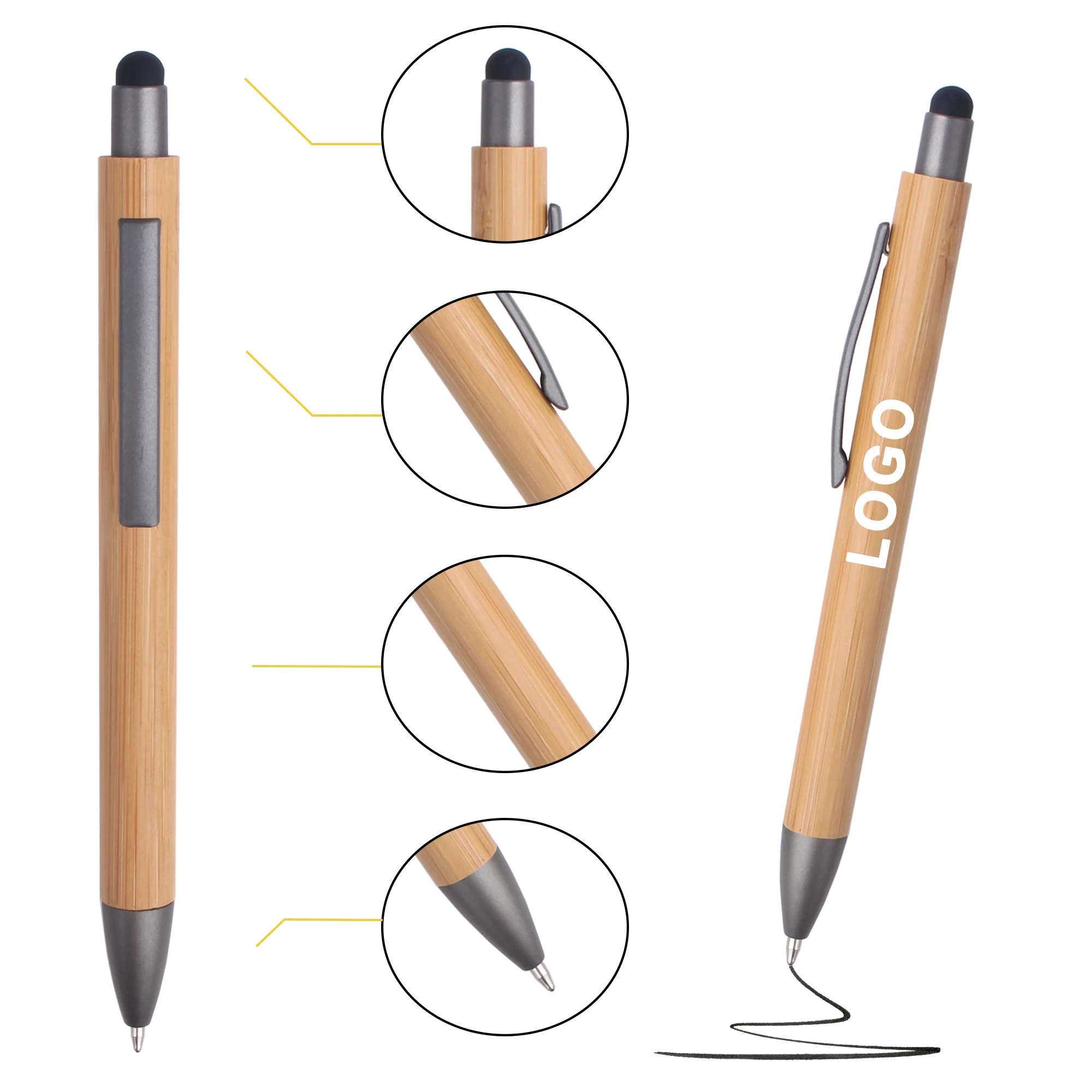 Promotional Cheap Eco-friendly Natural Recycled Click Bamboo Wood Ballpoint Pen With Top Stylus Custom Logo Printed Lasered