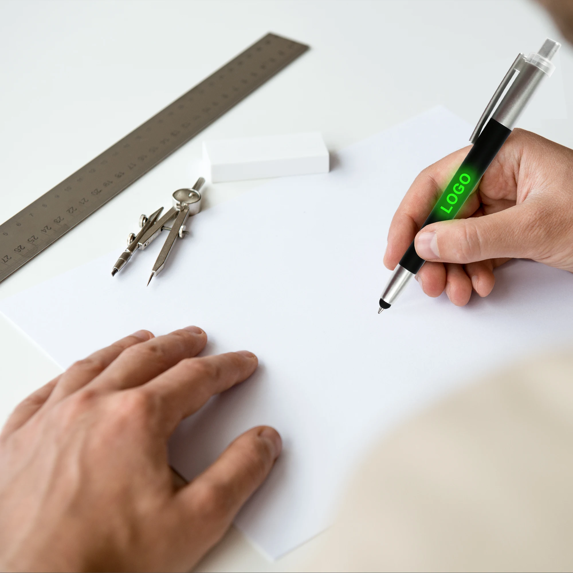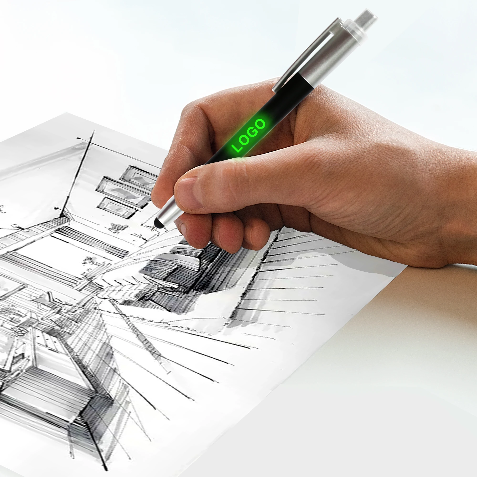 Promotional Creative LED Light Laser Custom Logo Print Plastic Ballpoint Pen With Touch Stylus for Stationery Gifts