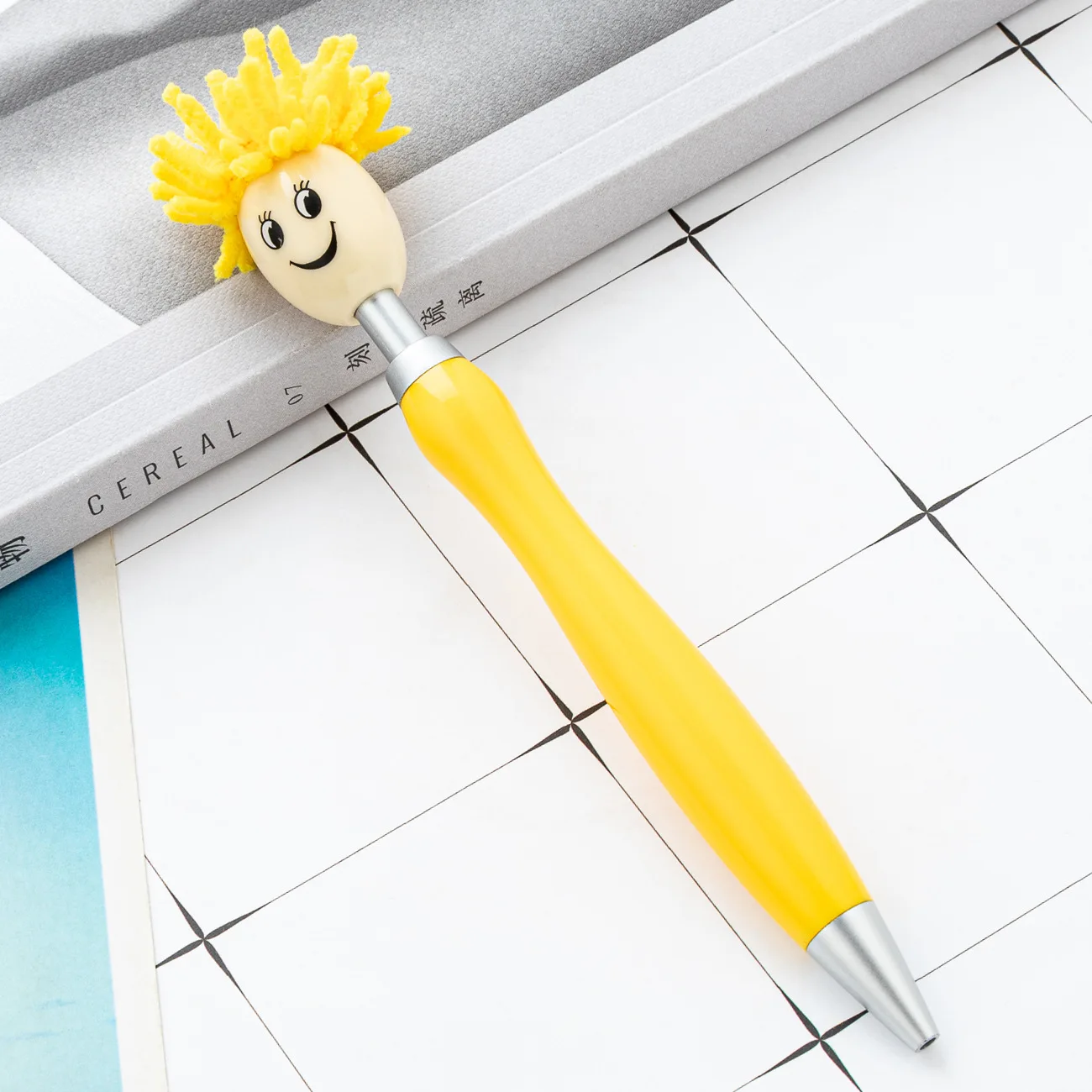 Wholesale Custom Logo Funny Plastic Mop Doll Topper for Sports Cute Ballpoint Pens Kids' Gift 1.0mm Smile Face Creative Design