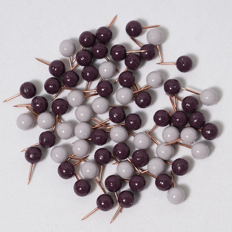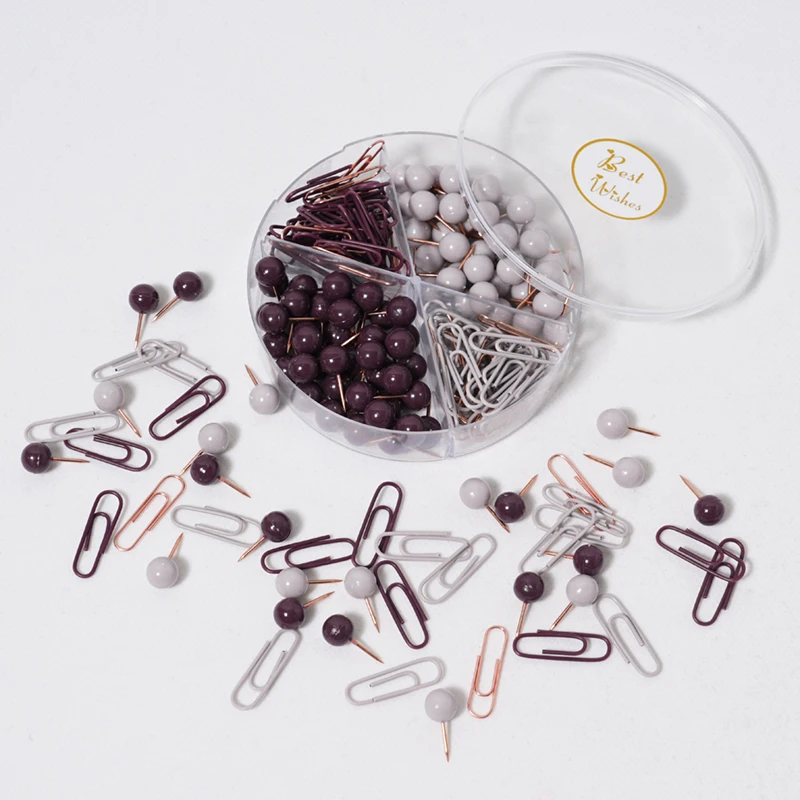 Elegant Office Stationery Set Plum Gray Push Pins with Paper Clips in Clear Divided Case, "Best Wishes" Design