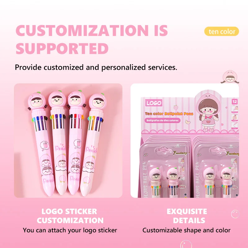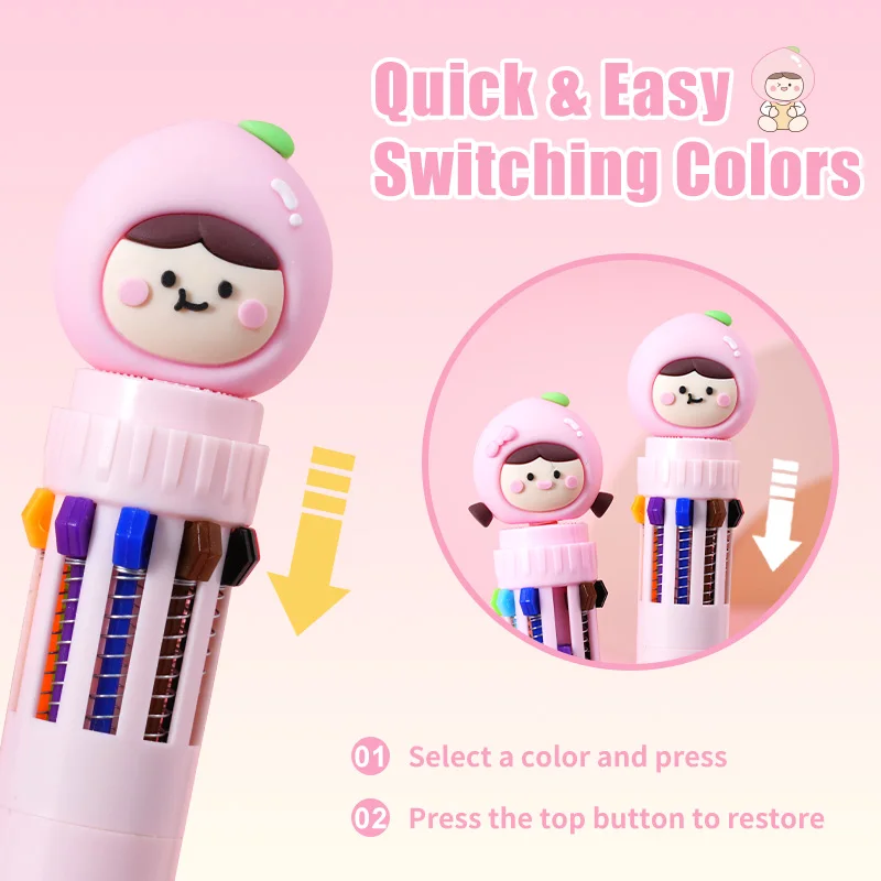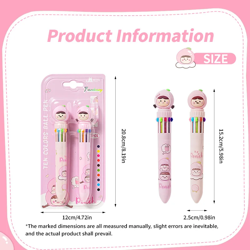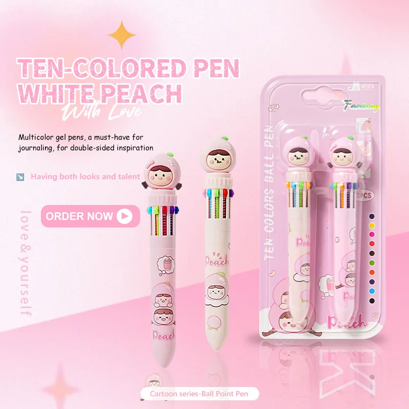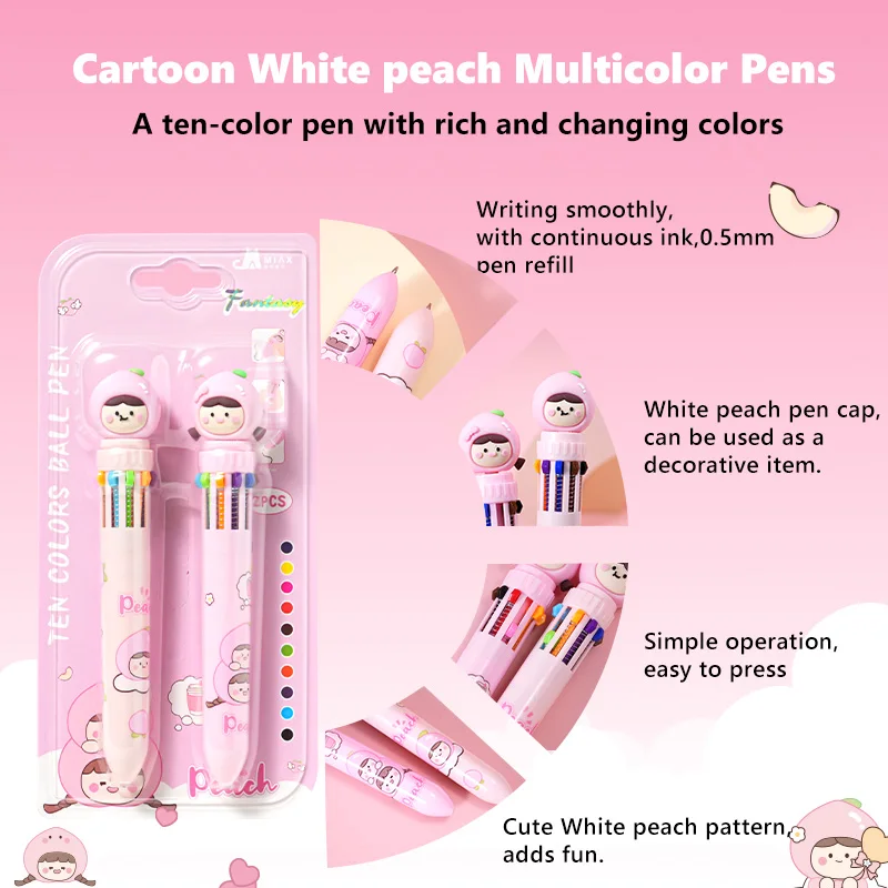 Best-Selling White Peach Cartoon Ten-Color Pen - 2PCS Kawaii Stationery for Kids & Students