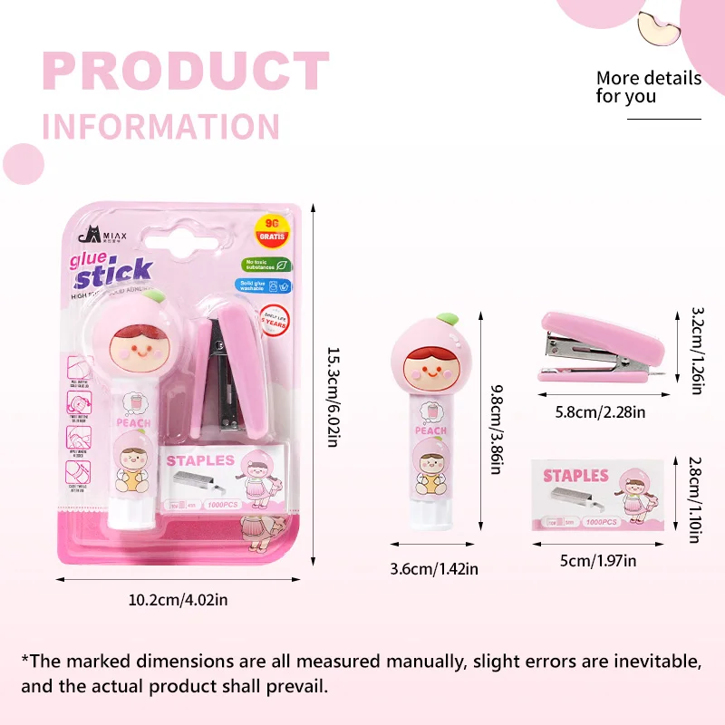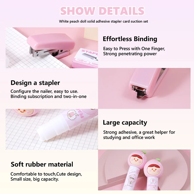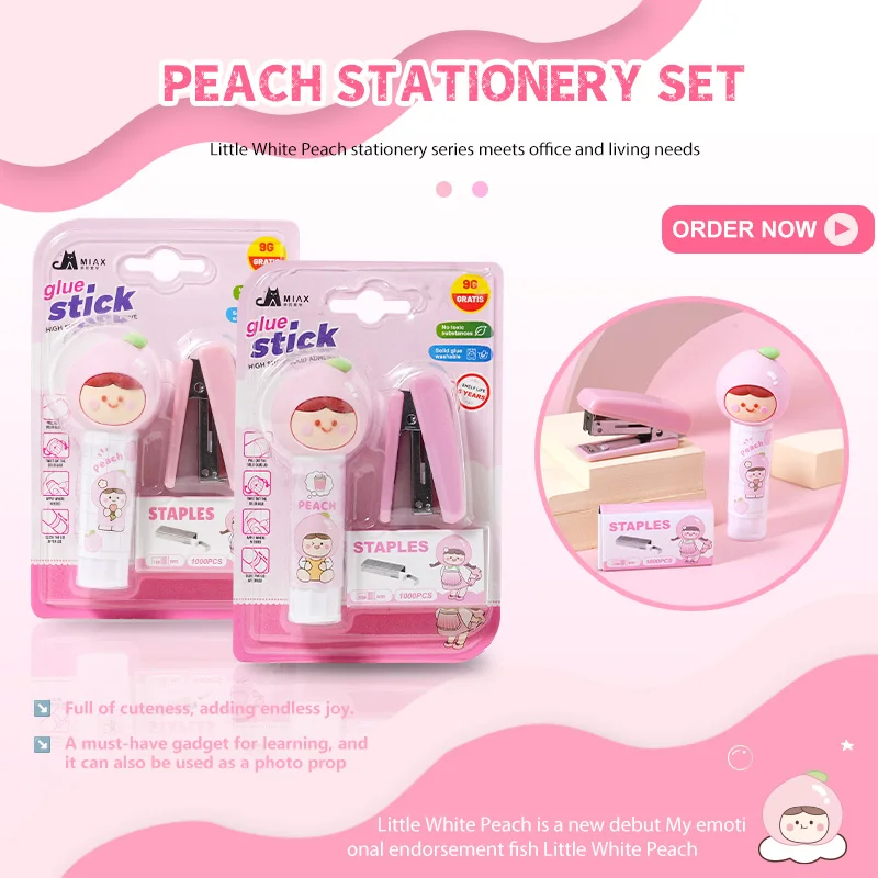 Kawaii White Peach Doll Solid Glue & Stapler Blister Card Set - Cute Stationery Kit